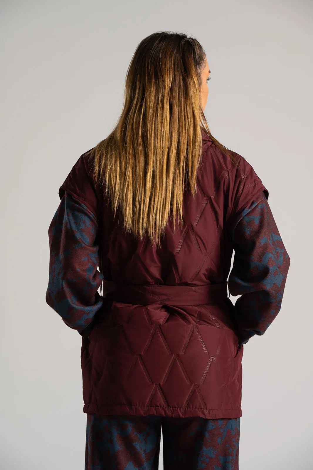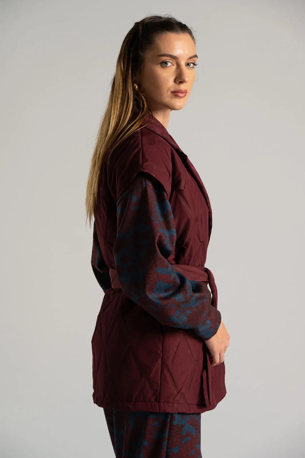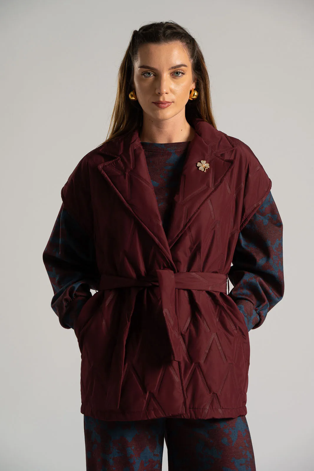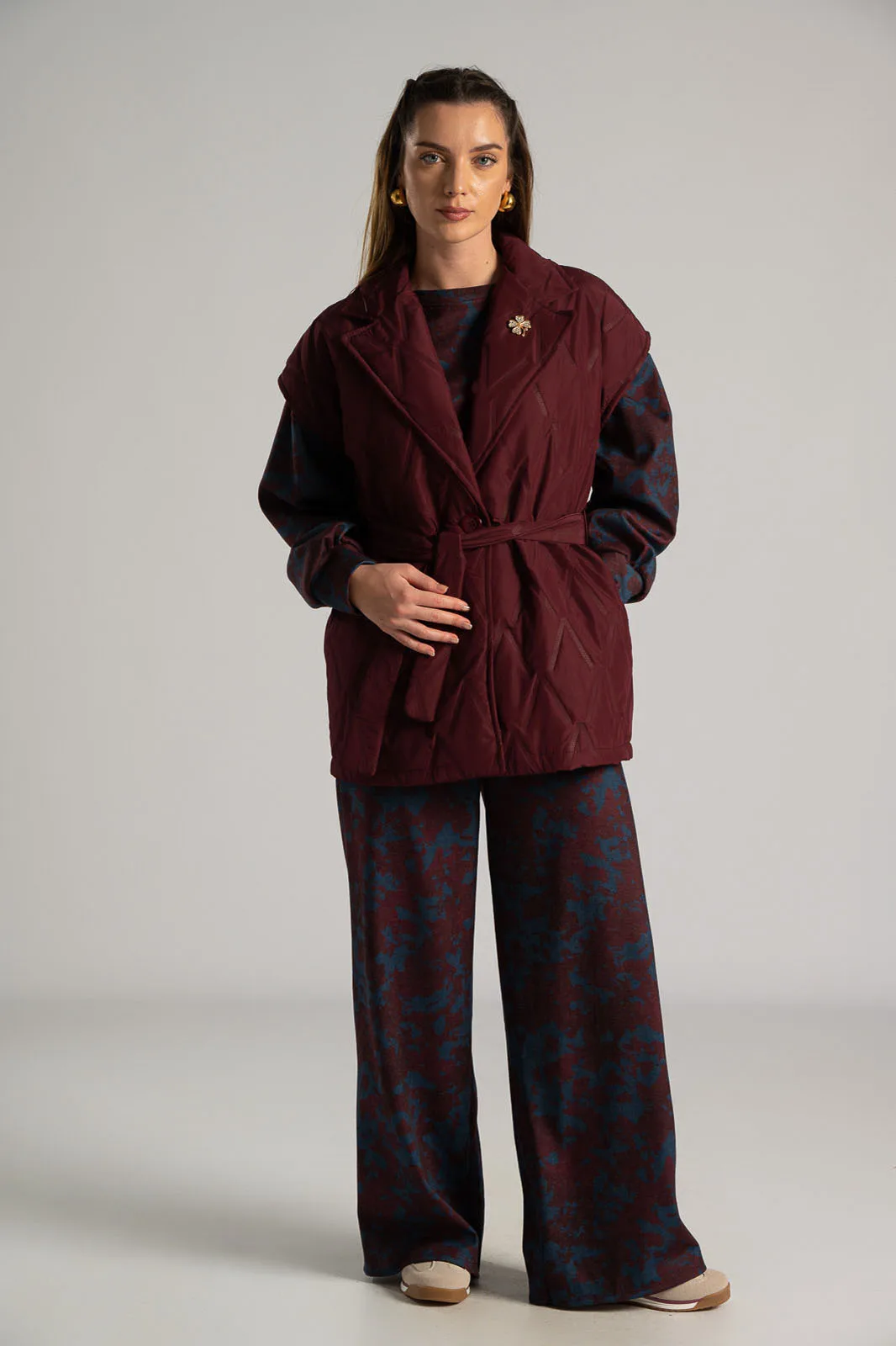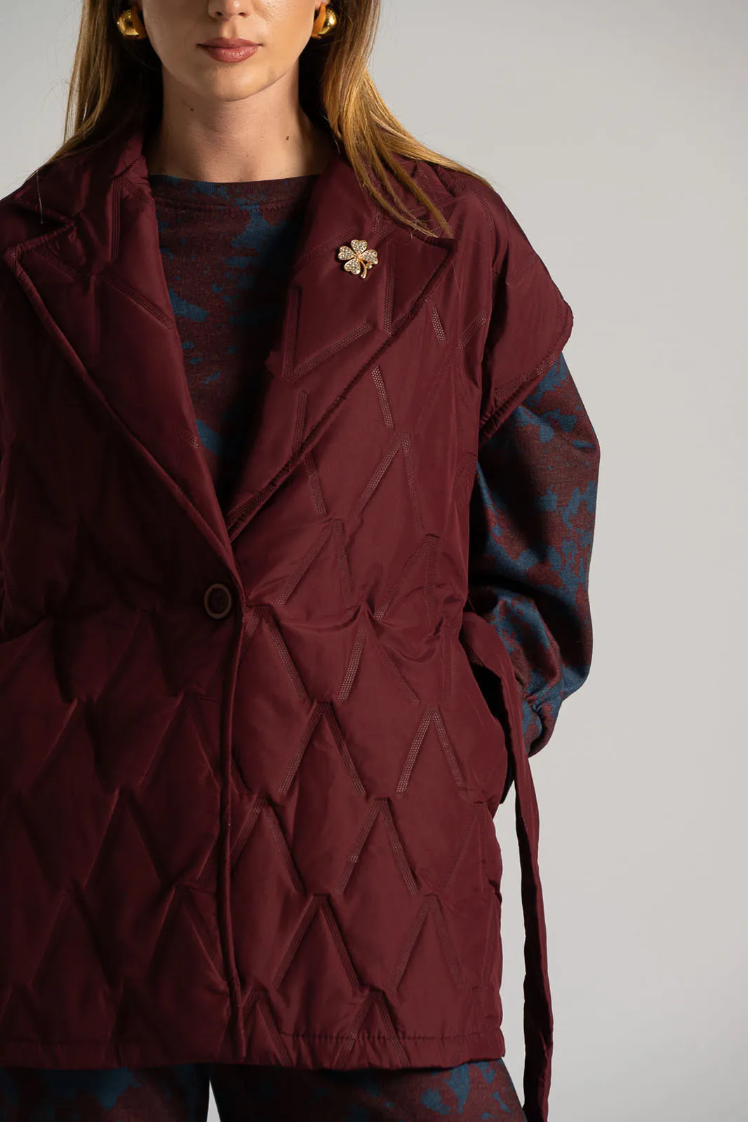 Μπουφάν καπιτονέ. Έχει γιακά και κλείνει με ένα κουμπί. Είναι αμάνικο. Έχει δική του ζώνη στην ίδια απόχρωση και υφή. Είναι φοδραρισμένο. Στα πλαινά διαθέτει τσέπες. Στο πέτο έχει διακοσμητική αποσπώμενη καρφίτσα. Η μέτρηση έχει γίνει με κλειστό κουμπί. Οι μετρήσεις του πίνακα είναι αντιπροσωπευτικές για κάθε προϊόν. 100% polyester.