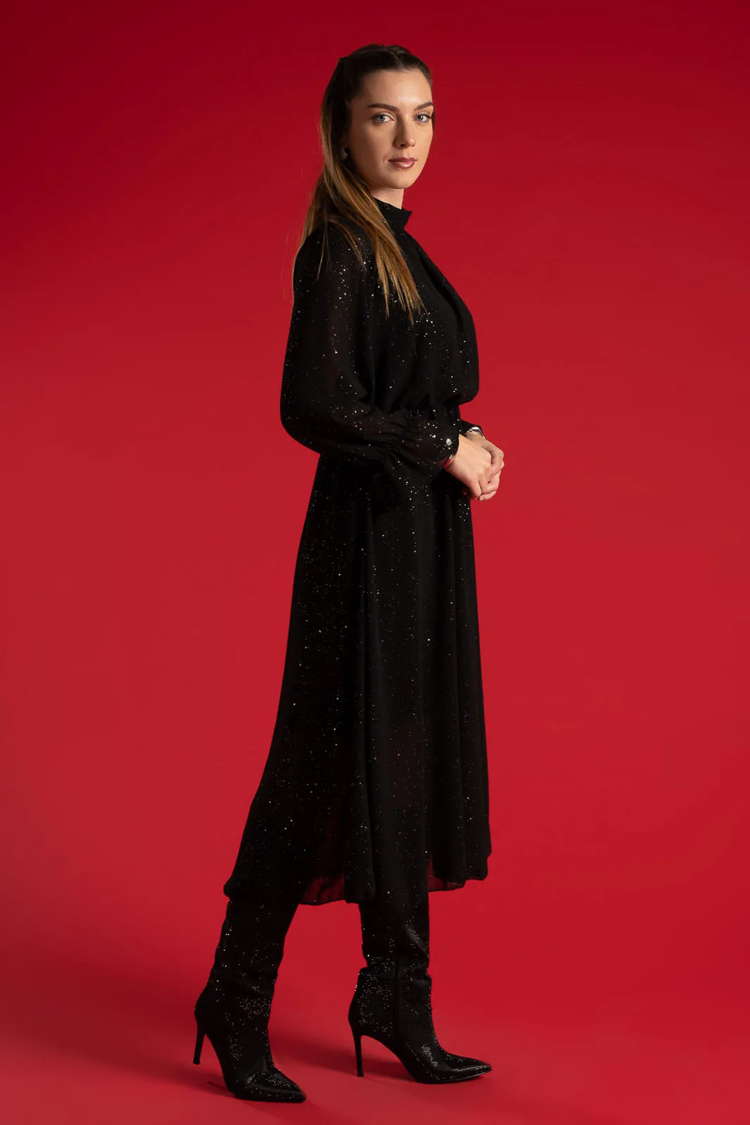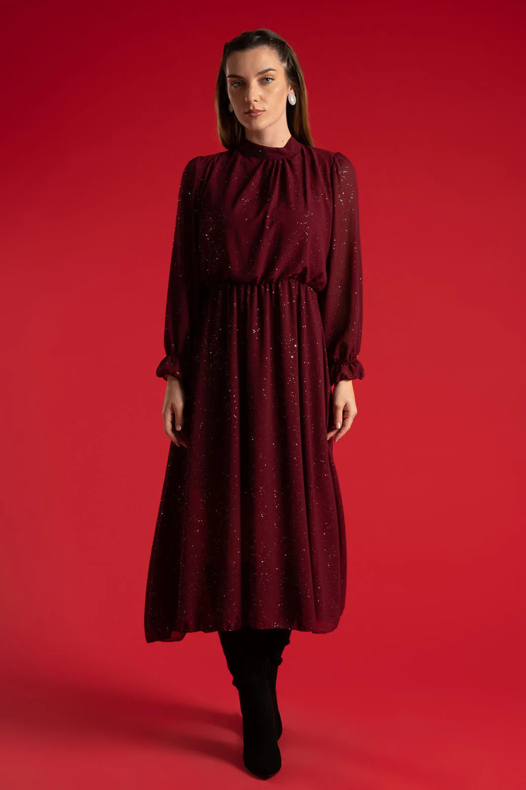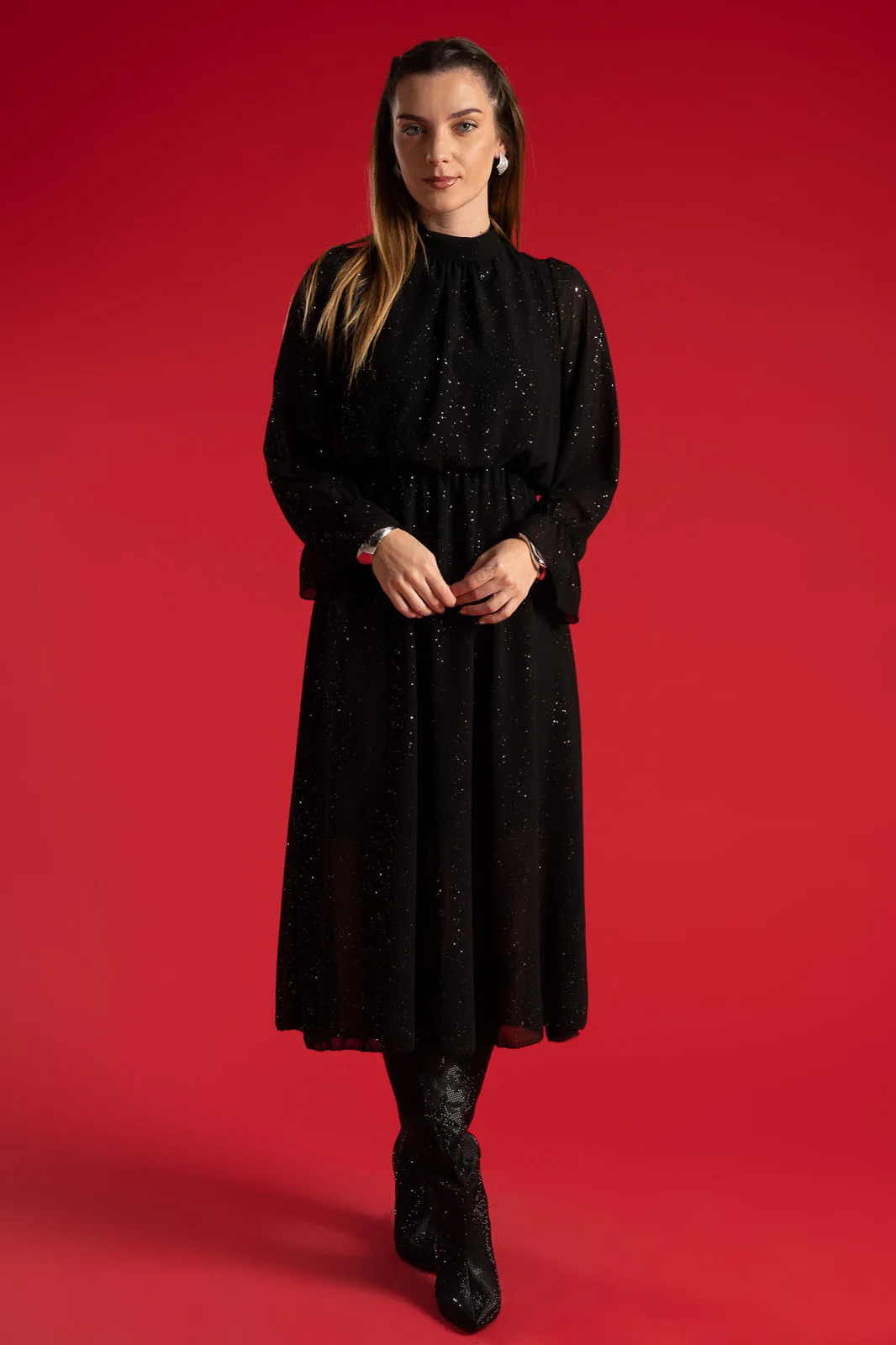 Φόρεμα midi με shimmer σε όλη την επιφάνεια του. Έχει μακριά μανίκια με λάστιχο στο τελείωμα. Στη μέση έχει λάστιχο για καλύτερη εφαρμογή. Εσωτερικά στον κορμό είναι φοδραρισμένη. Οι μετρήσεις του πίνακα είναι αντιπροσωπευτικές για κάθε προϊόν. 100% polyester.