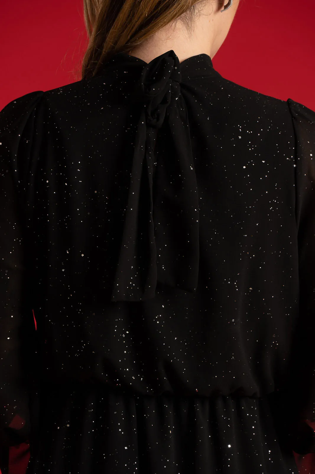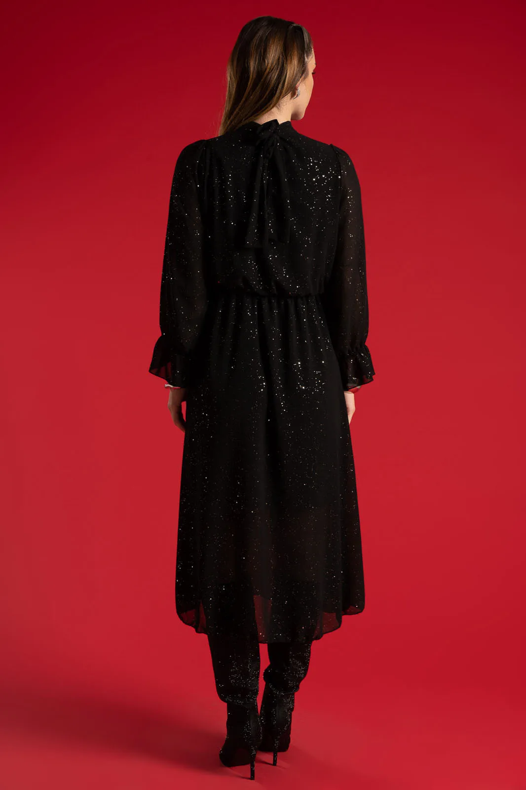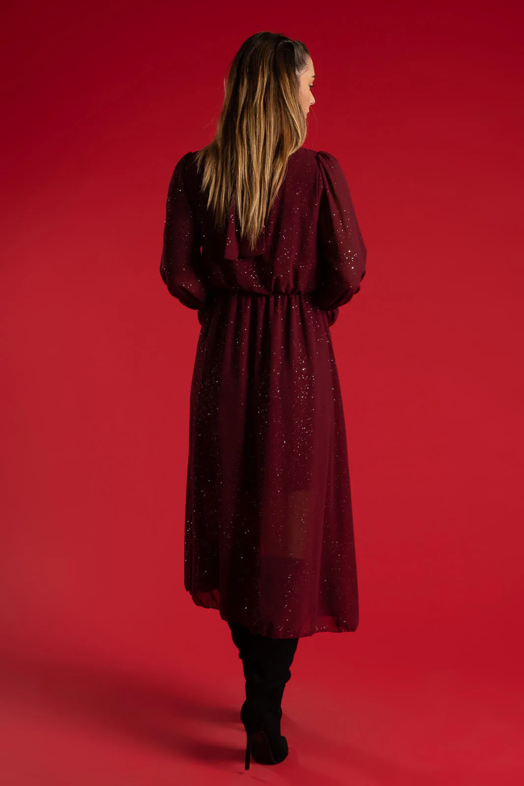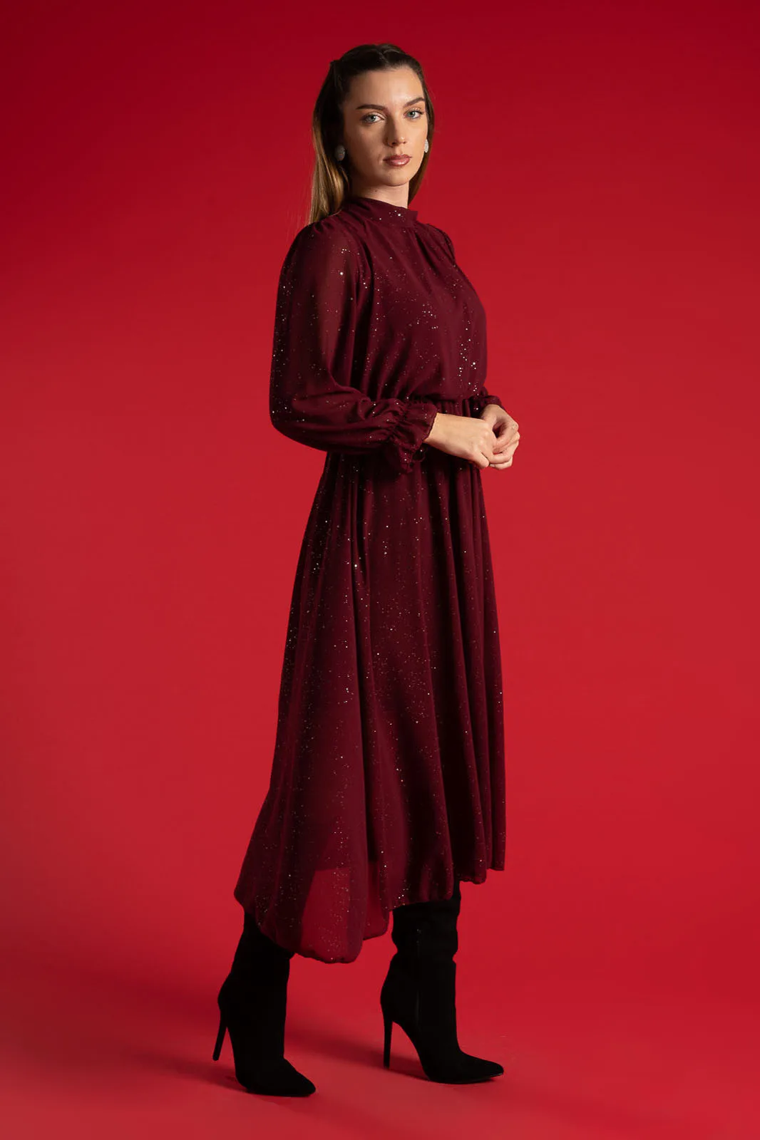 Φόρεμα midi με shimmer σε όλη την επιφάνεια του. Έχει μακριά μανίκια με λάστιχο στο τελείωμα. Στη μέση έχει λάστιχο για καλύτερη εφαρμογή. Εσωτερικά στον κορμό είναι φοδραρισμένη. Οι μετρήσεις του πίνακα είναι αντιπροσωπευτικές για κάθε προϊόν. 100% polyester.