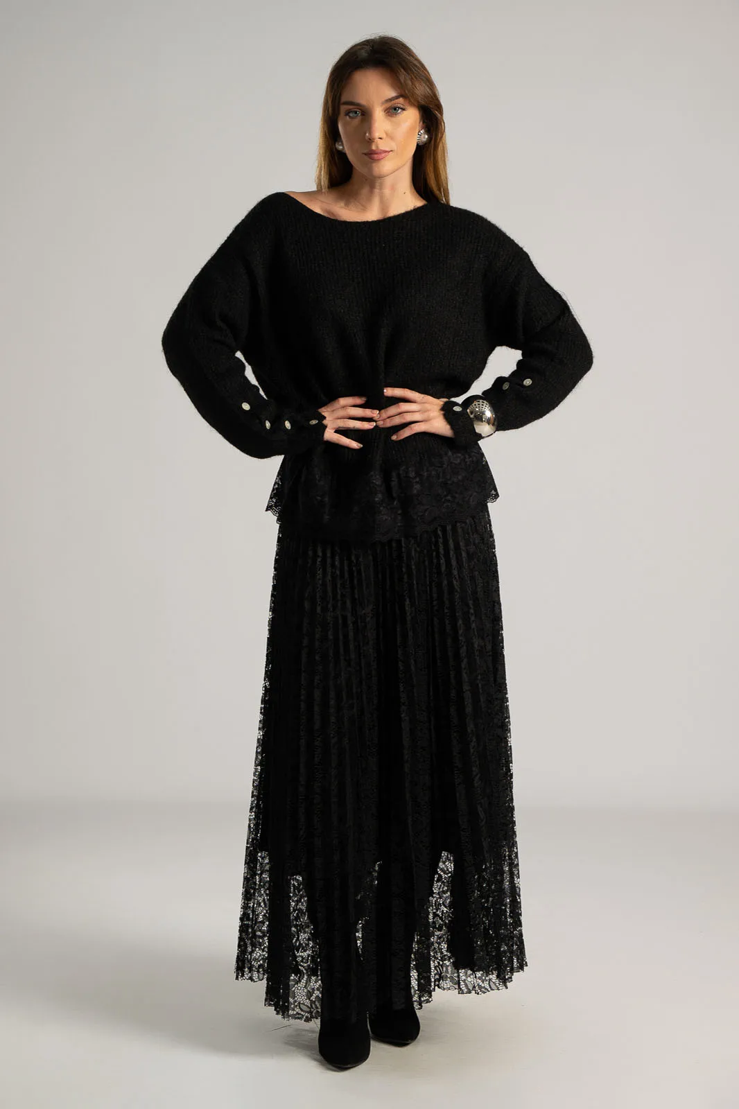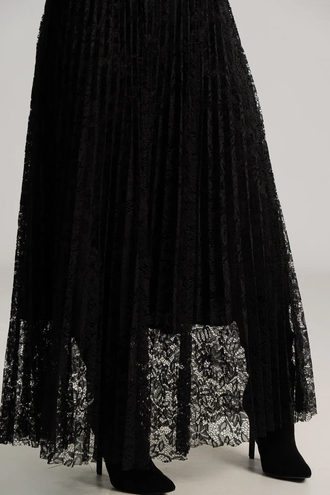 Maxi pleated skirt. It has elastic around the waist for a better fit. It is lace and has a lining inside. It is ideal for any occasion. The measurements in the table are representative for each product. 100% polyester.
