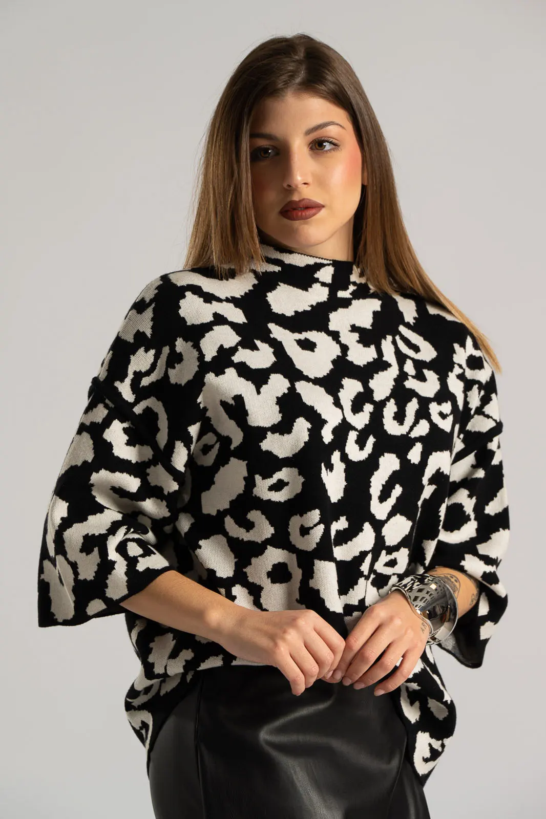 Blouse with compact knit and round neckline. It has 3/4 sleeves. It has a leopard pattern all over. The measurements in the table are representative for each code. 30% polyamide, 30% viscose, 20% modal, 20 elastane.