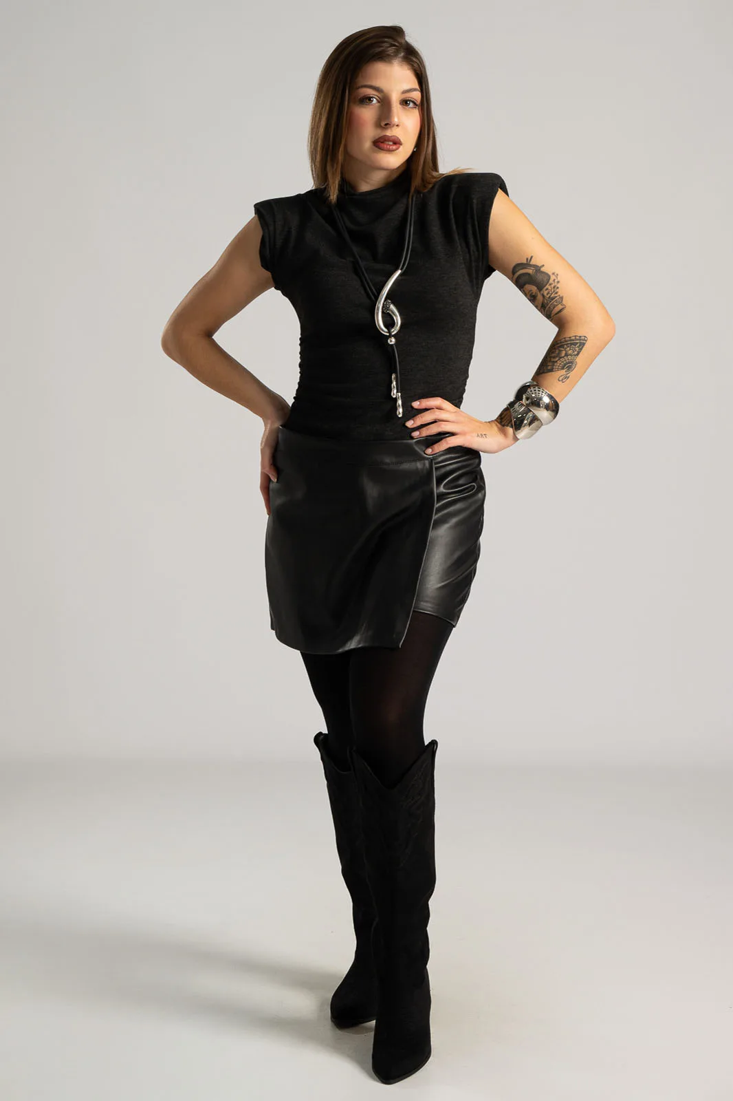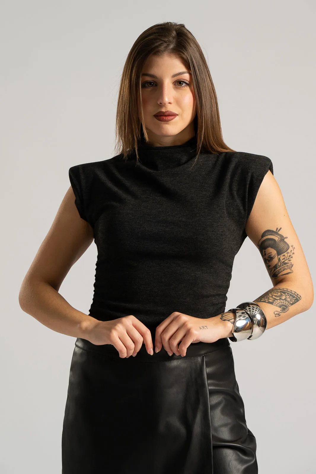 Blouse with compact knit fabric and lupeto neckline. It is sleeveless and has shoulder pads. It has pleats on the sides. The measurements in the table are representative for each product. 69% polyester, 28% viscose, 3% elastane.
