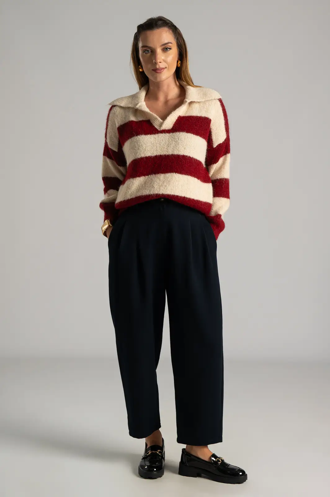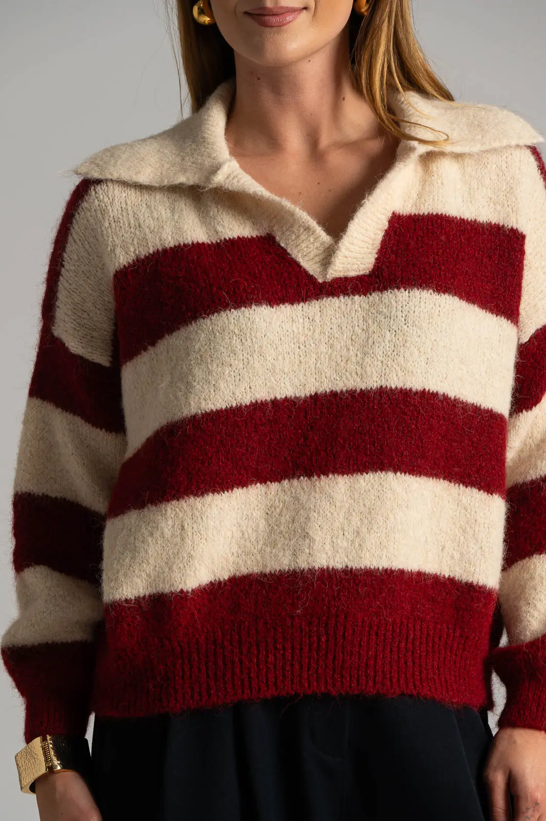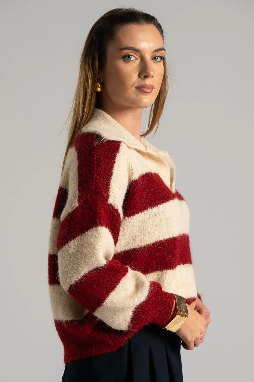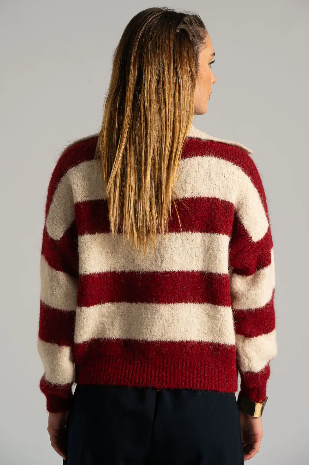 Μπλούζα που διαθέτει V άνοιγμα στην λαιμόκοψη και γιακά. Έχει μακριά μανίκια. Σε όλη τη επιφάνεια διαθέτει ρίγες φαρδιές. Οι μετρήσεις του πίνακα είναι αντιπροσωπευτικές για κάθε κωδικό. 59% polyester recycled, 21% nylon, 8% wool, 1% spandex.