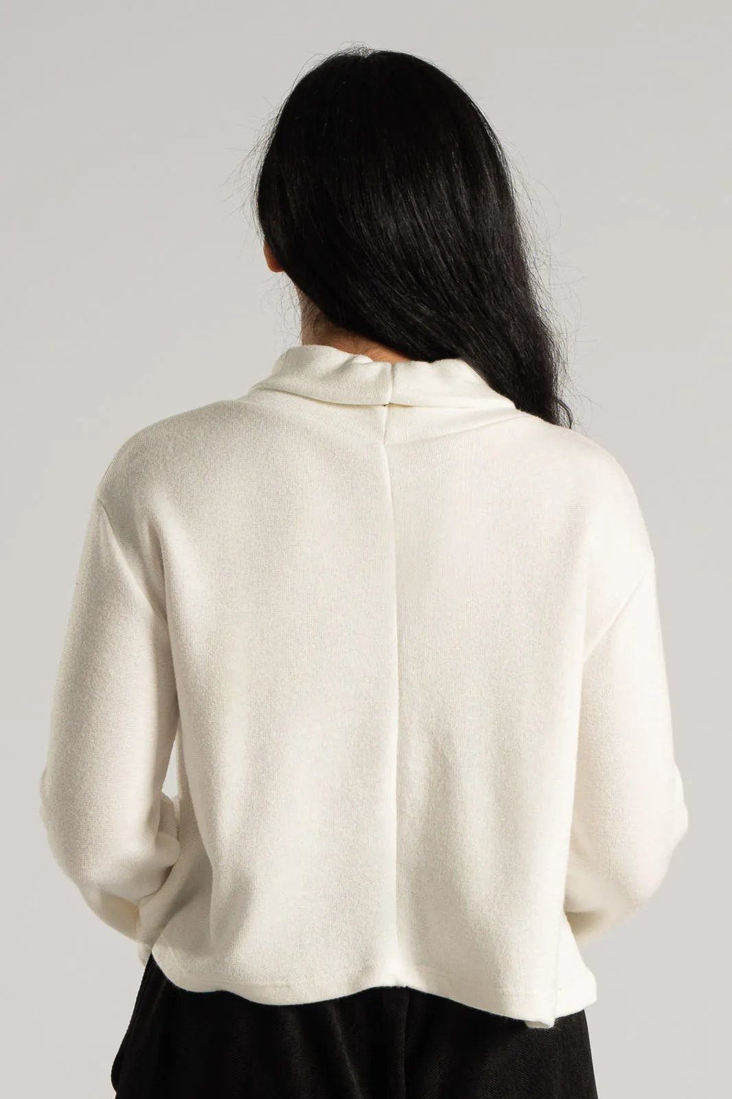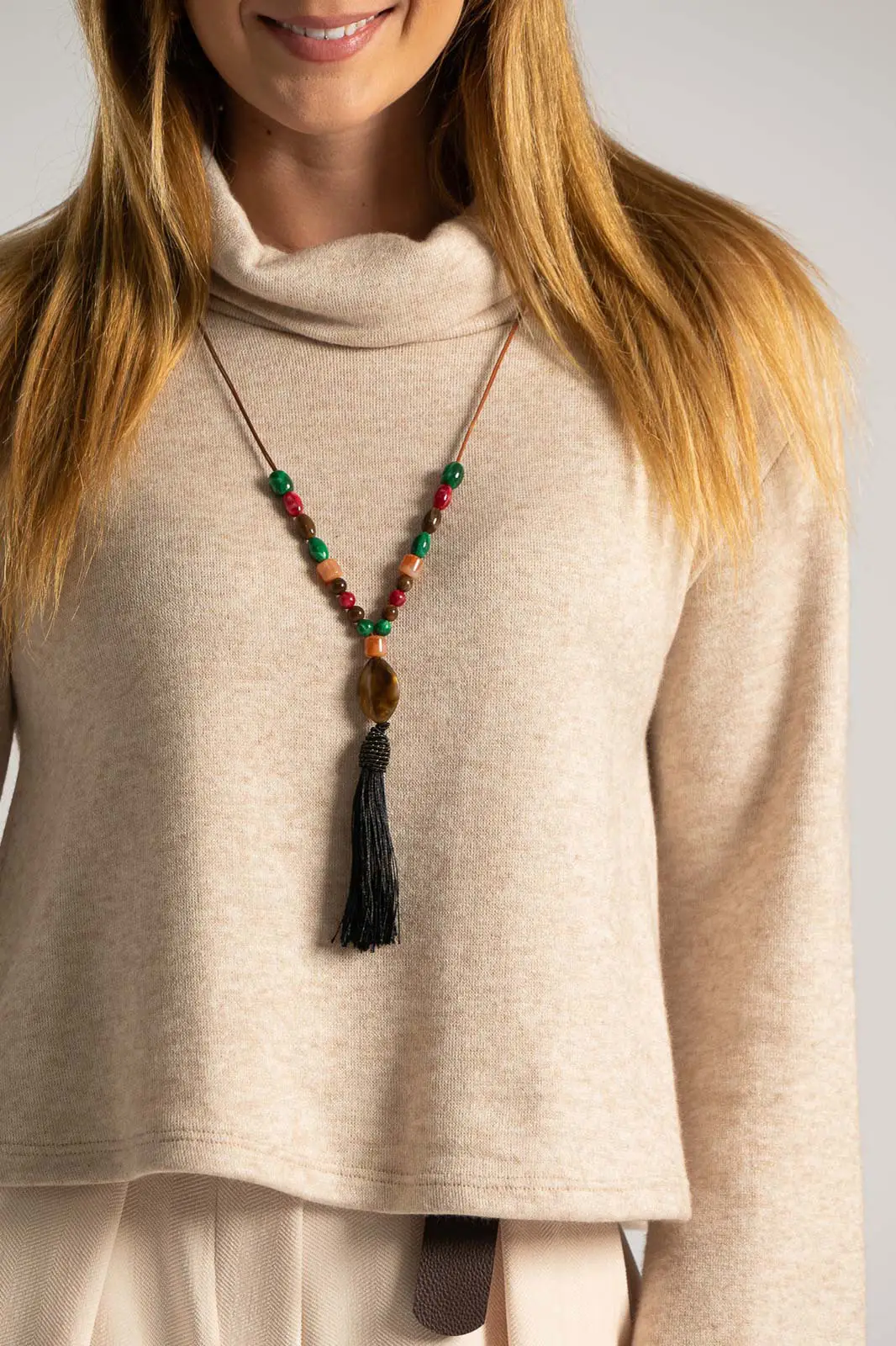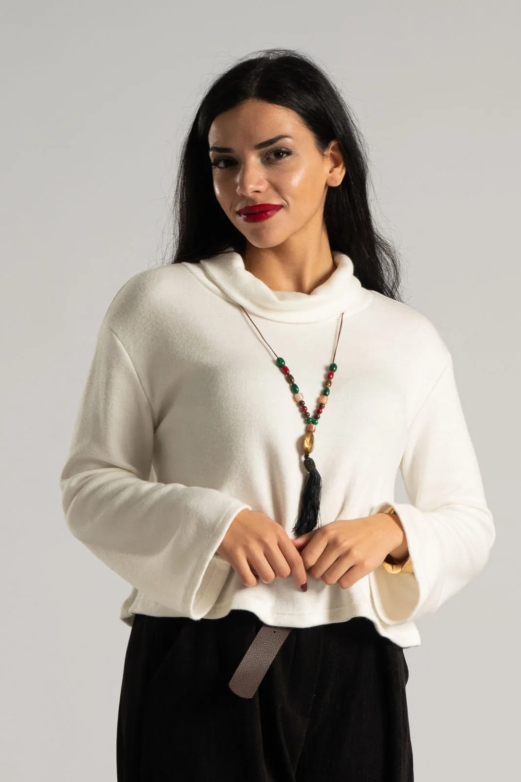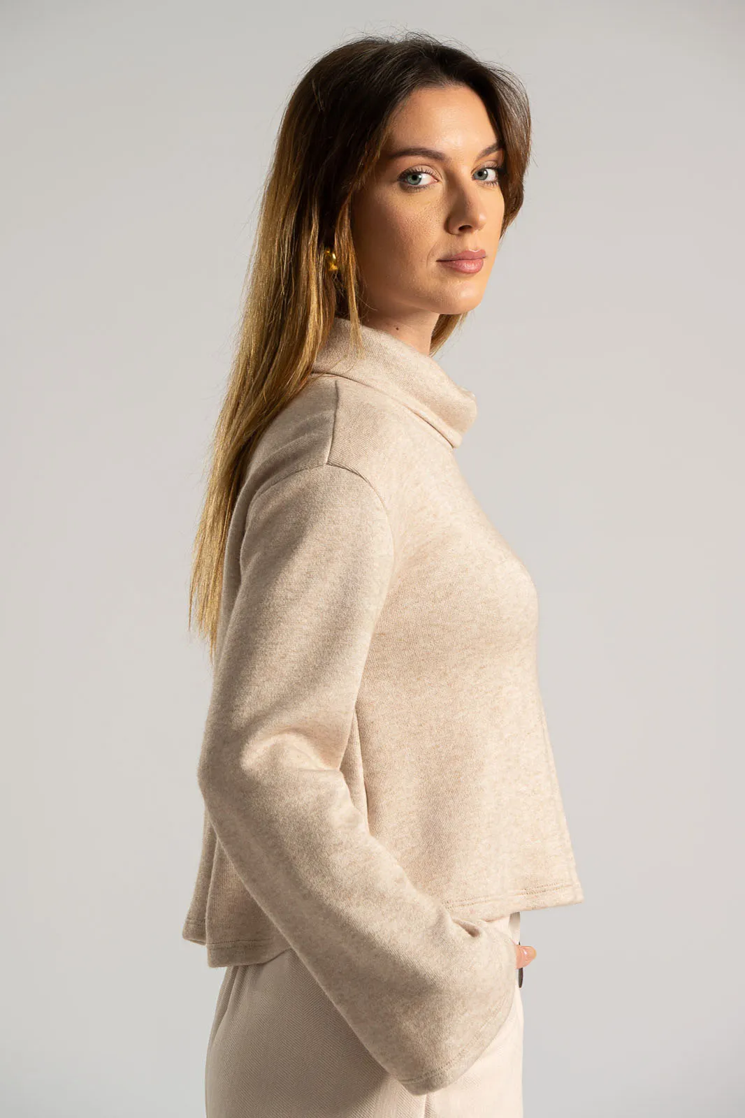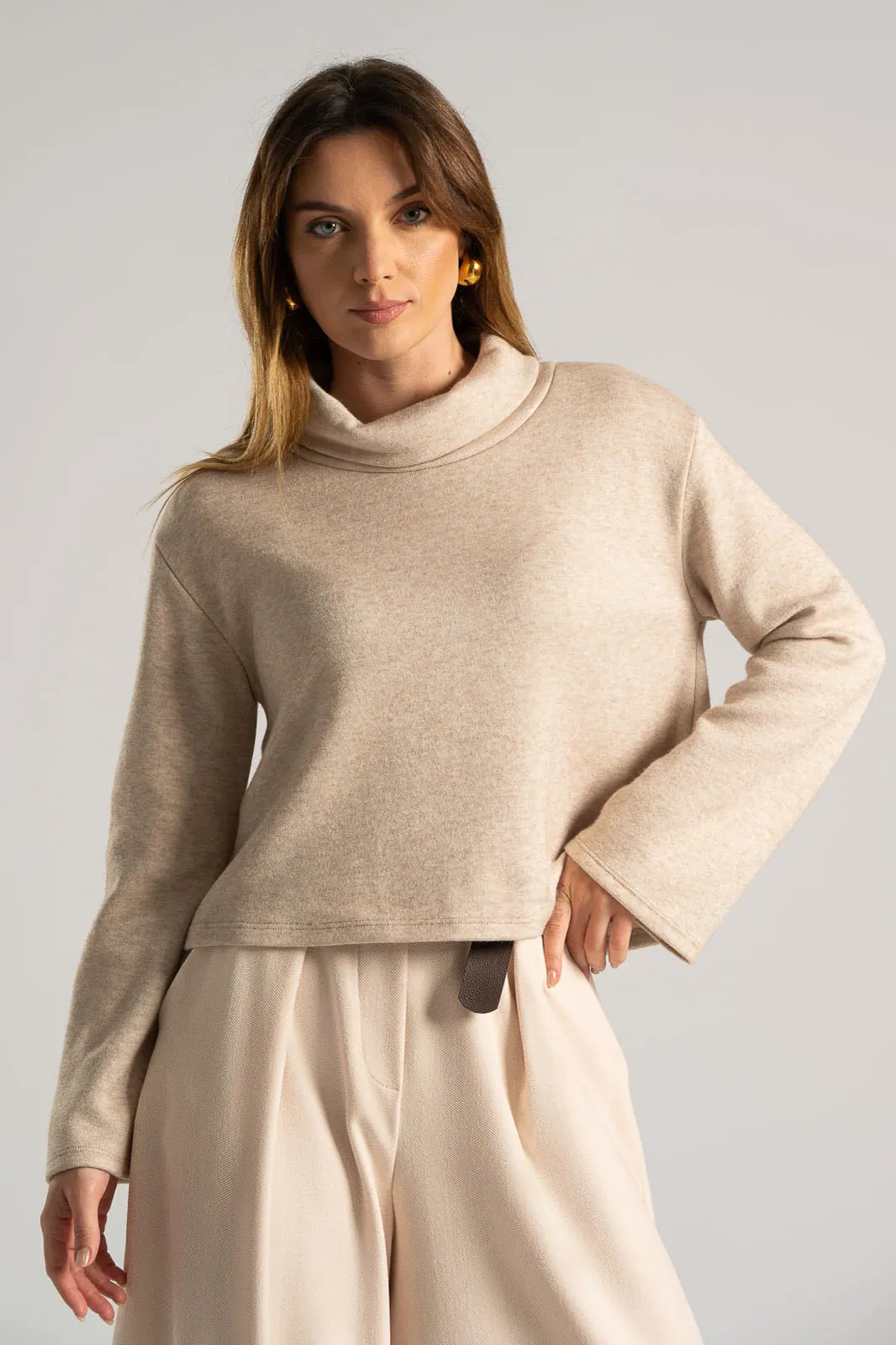 Threaded blouse with loose turtleneck. It is melange and has long sleeves. It has its own lace/">necklace. It has a straight line and its fabric is very soft. The measurements in the table are representative of each product. 95% viscose, 5% elastane.