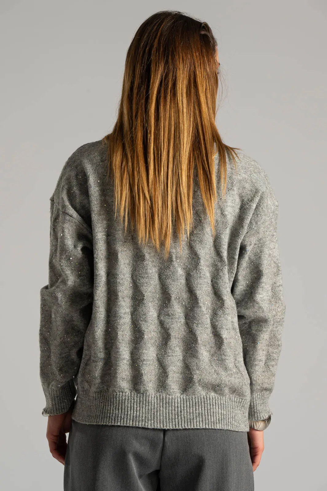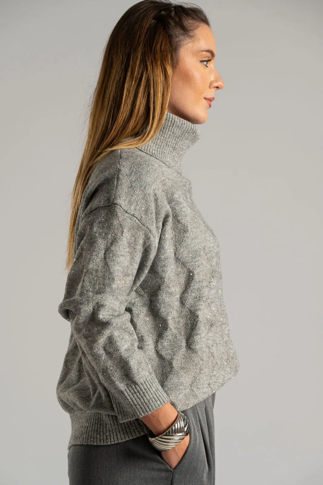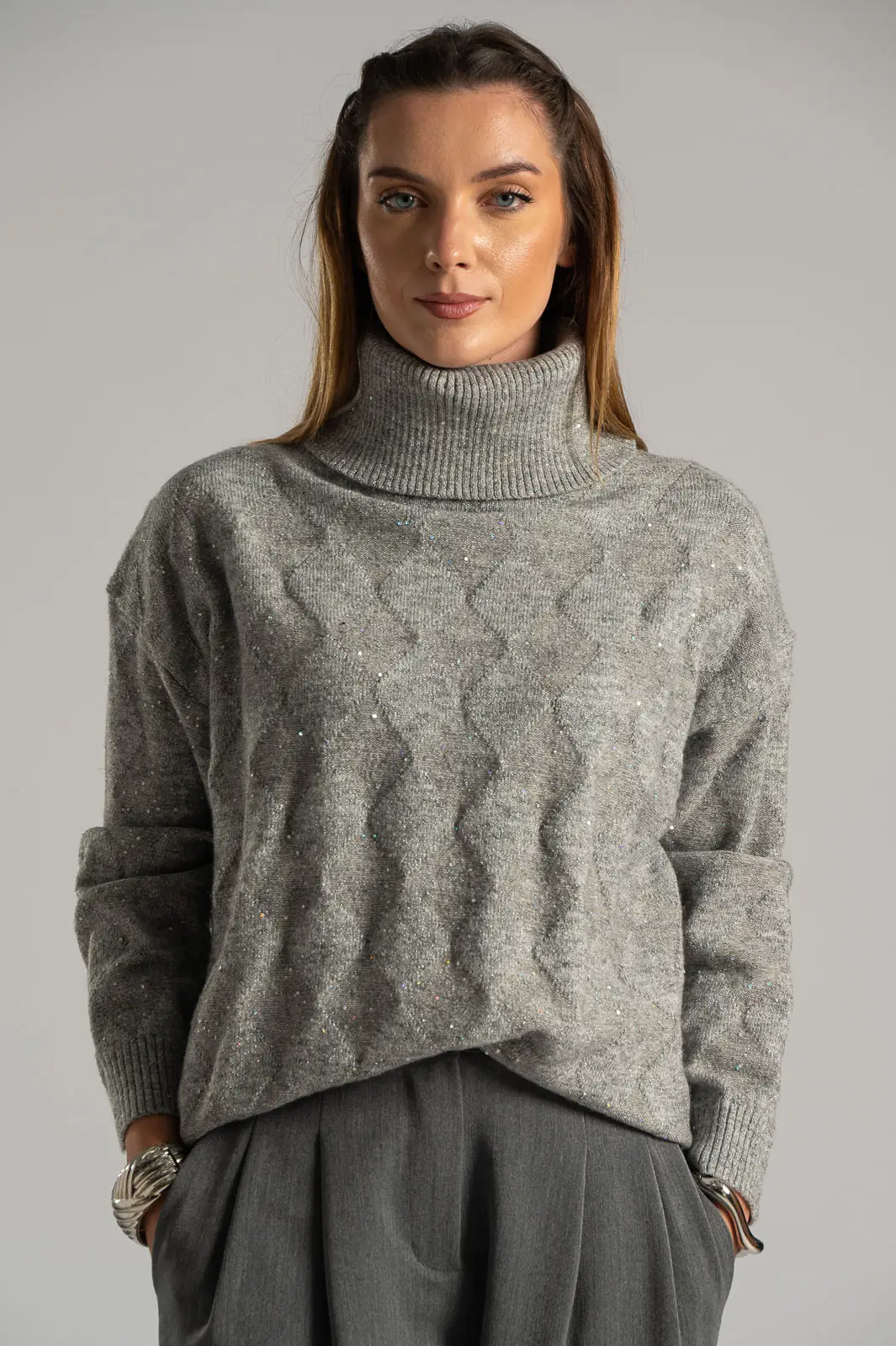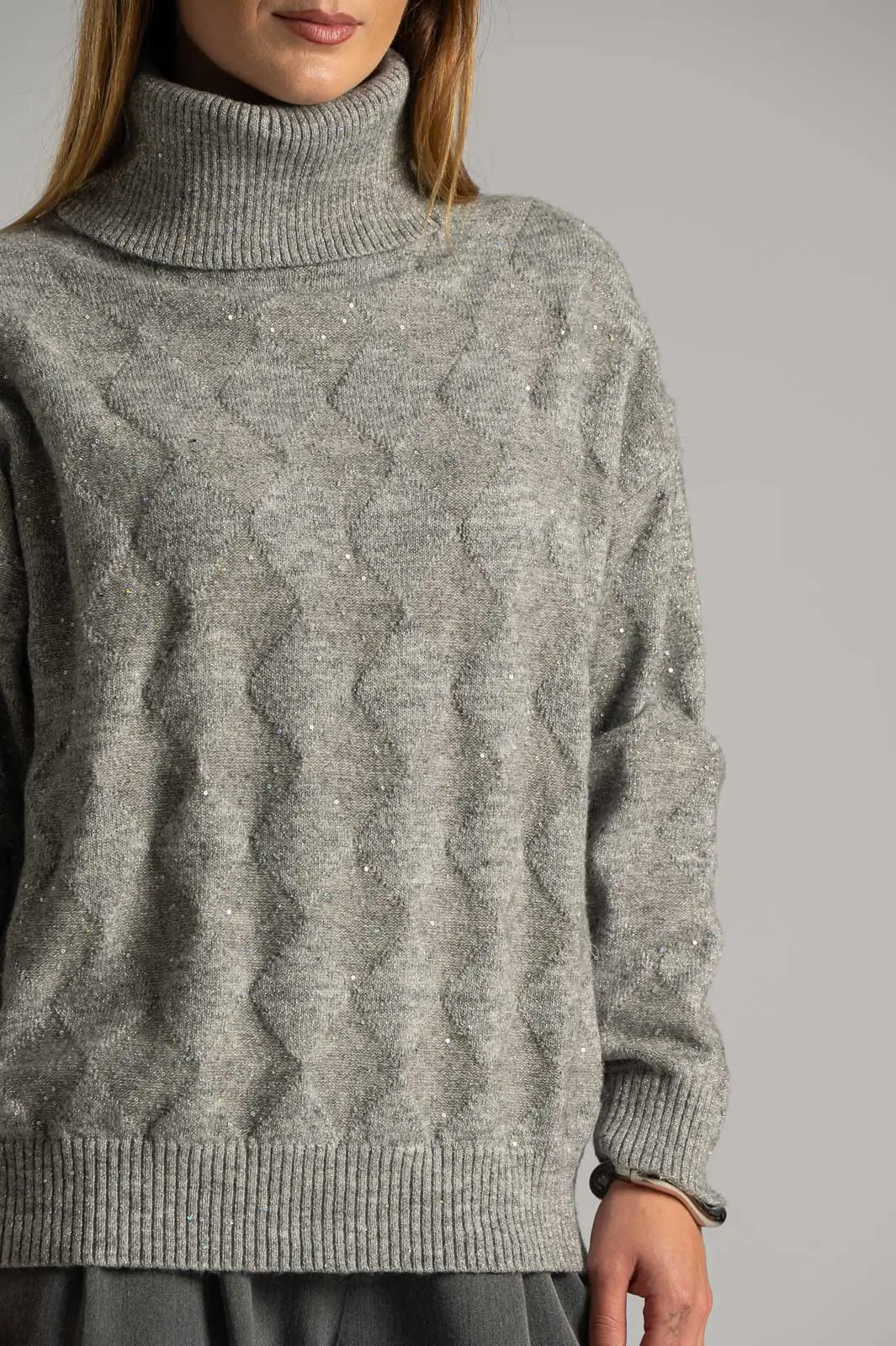 Πουλόβερ με ζιβάγκο λαιμόκοψη. Διαθέτει μακριά μανίκια. Σε όλη την επιφάνεια έχει διακοσμητικές μικρές παγιέτες με ασημοκλωστή. Είναι σε ίσια γραμμή. Οι μετρήσεις του πίνακα είναι αντιπροσωπευτικές για κάθε προϊόν. 30% acrylic, 30% viscose, 20% modal, 20% elastan.