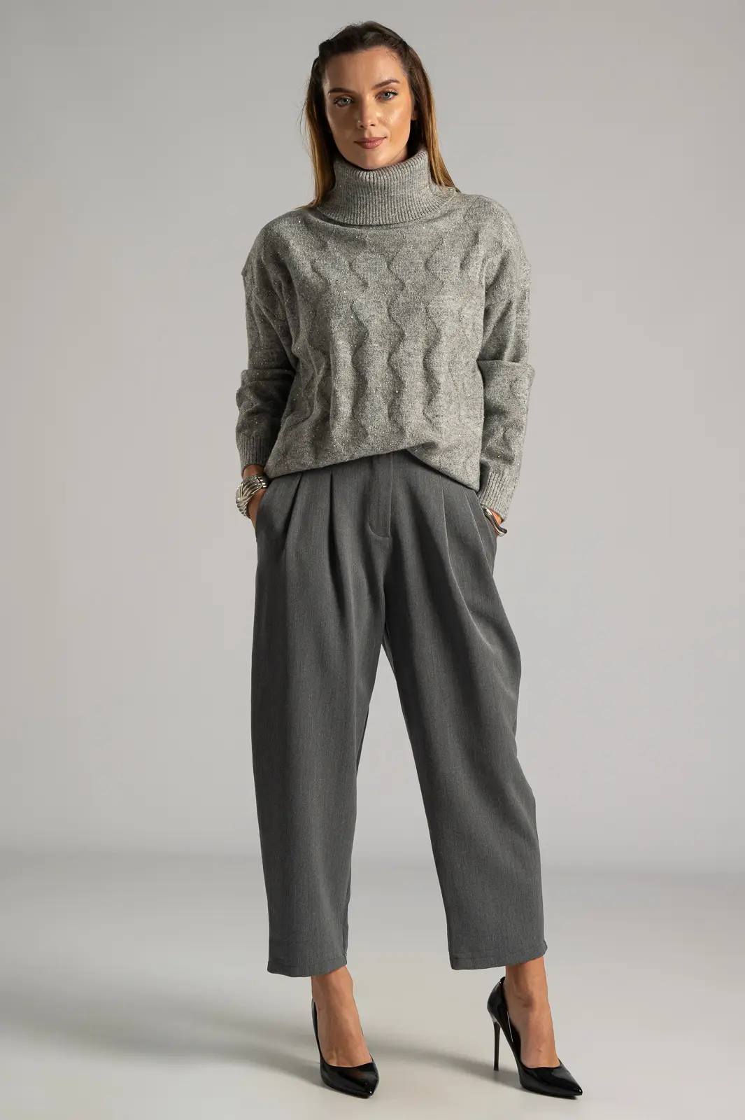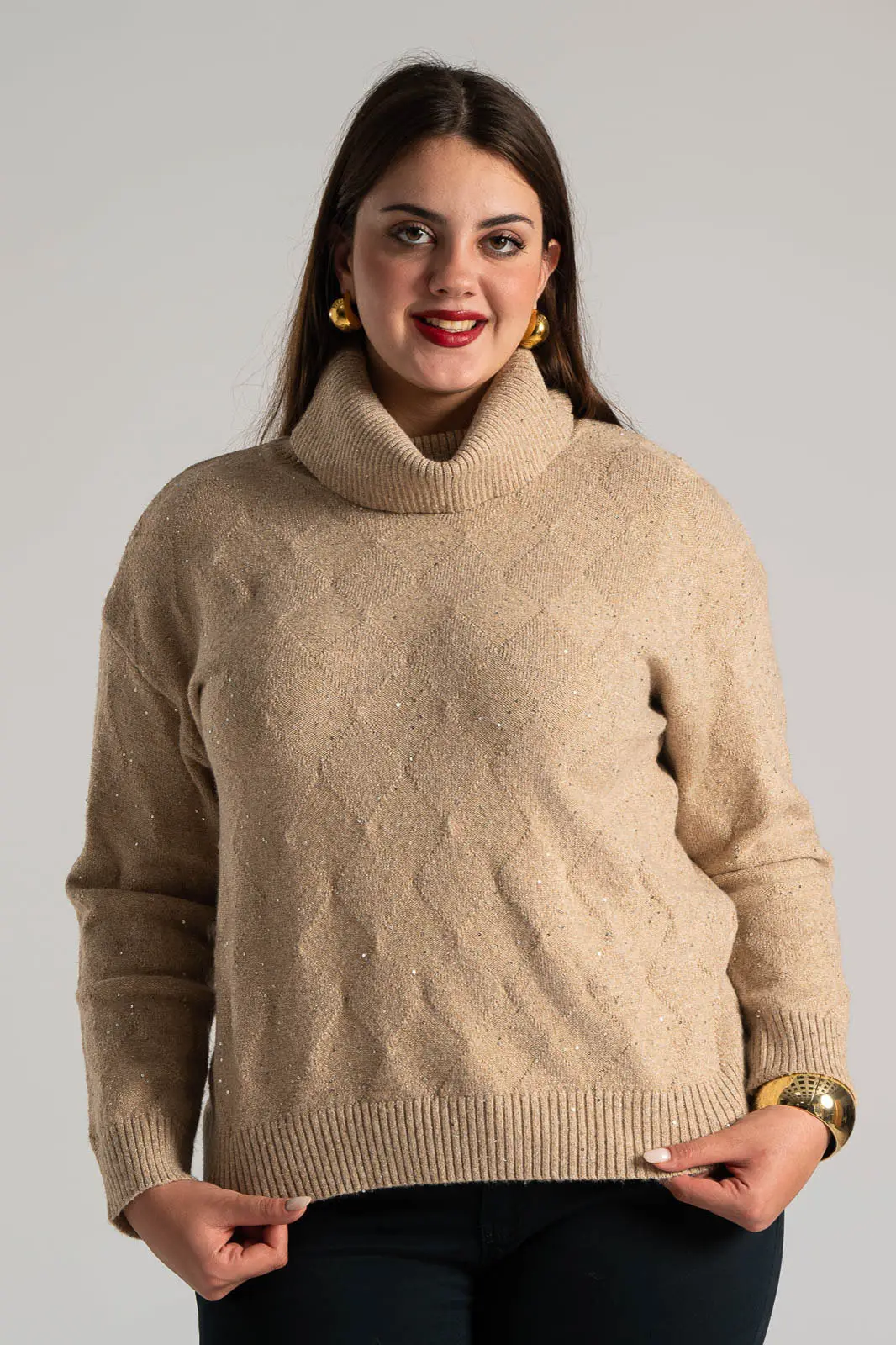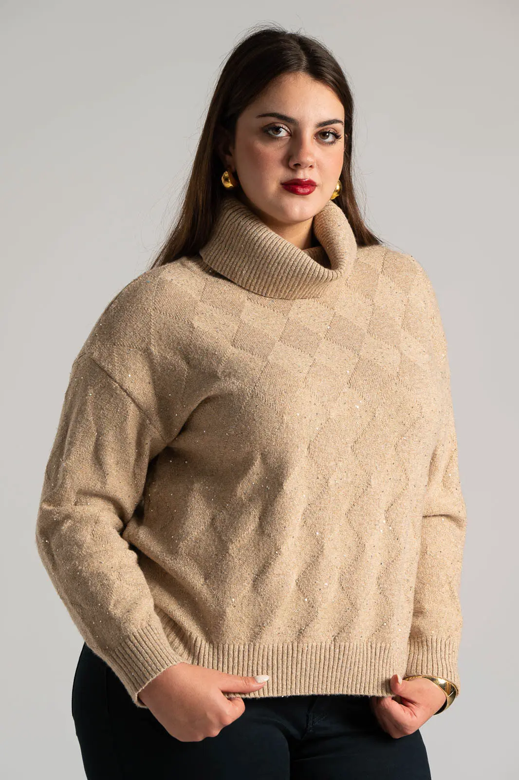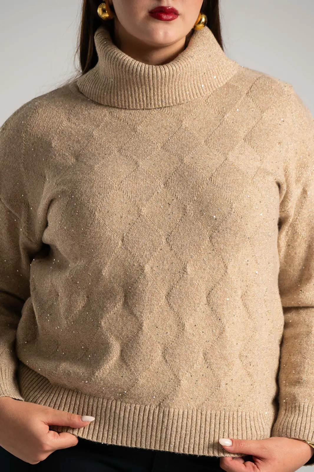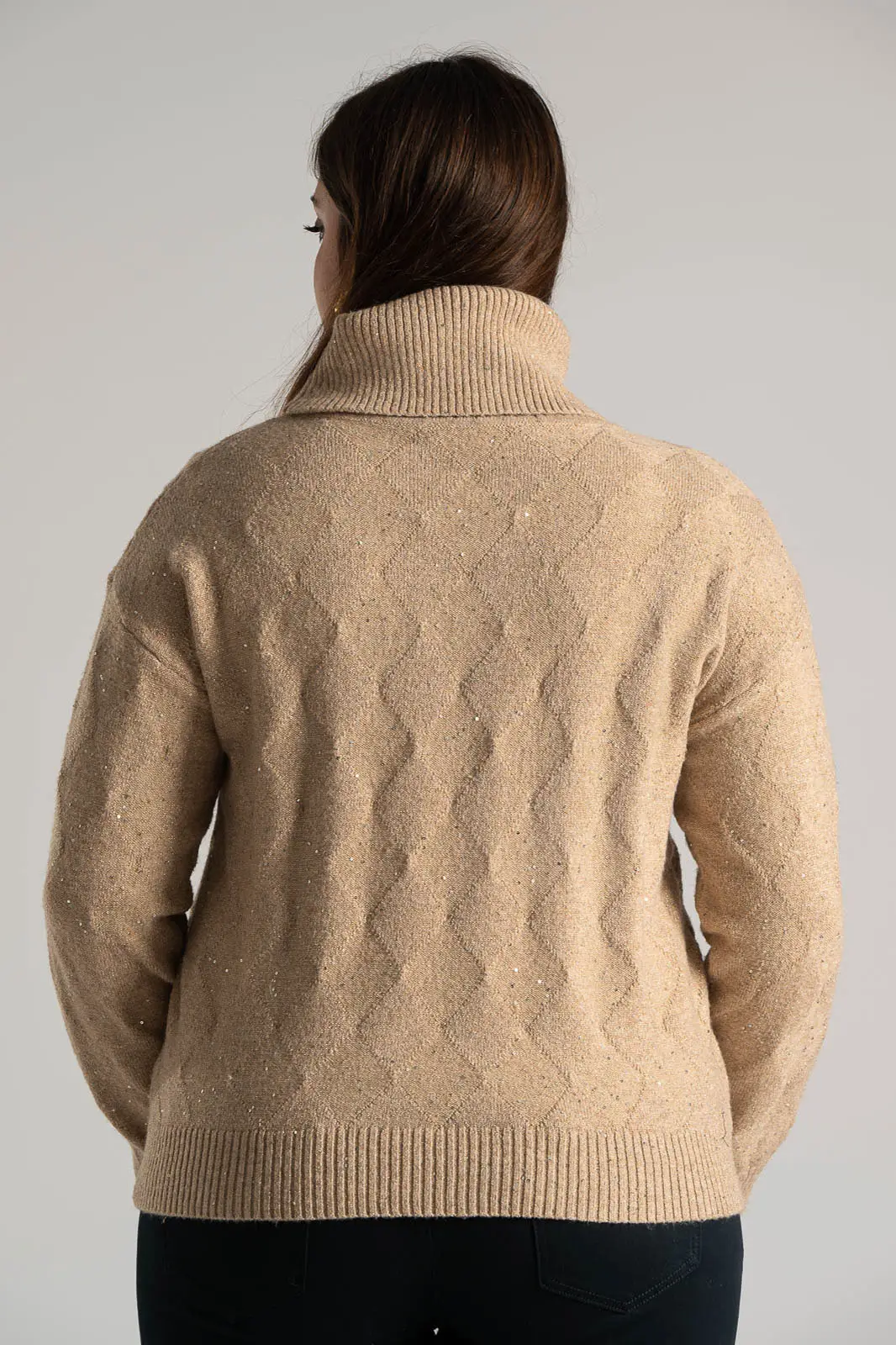 Πουλόβερ με ζιβάγκο λαιμόκοψη. Διαθέτει μακριά μανίκια. Σε όλη την επιφάνεια έχει διακοσμητικές μικρές παγιέτες με ασημοκλωστή. Είναι σε ίσια γραμμή. Οι μετρήσεις του πίνακα είναι αντιπροσωπευτικές για κάθε προϊόν. 30% acrylic, 30% viscose, 20% modal, 20% elastan.