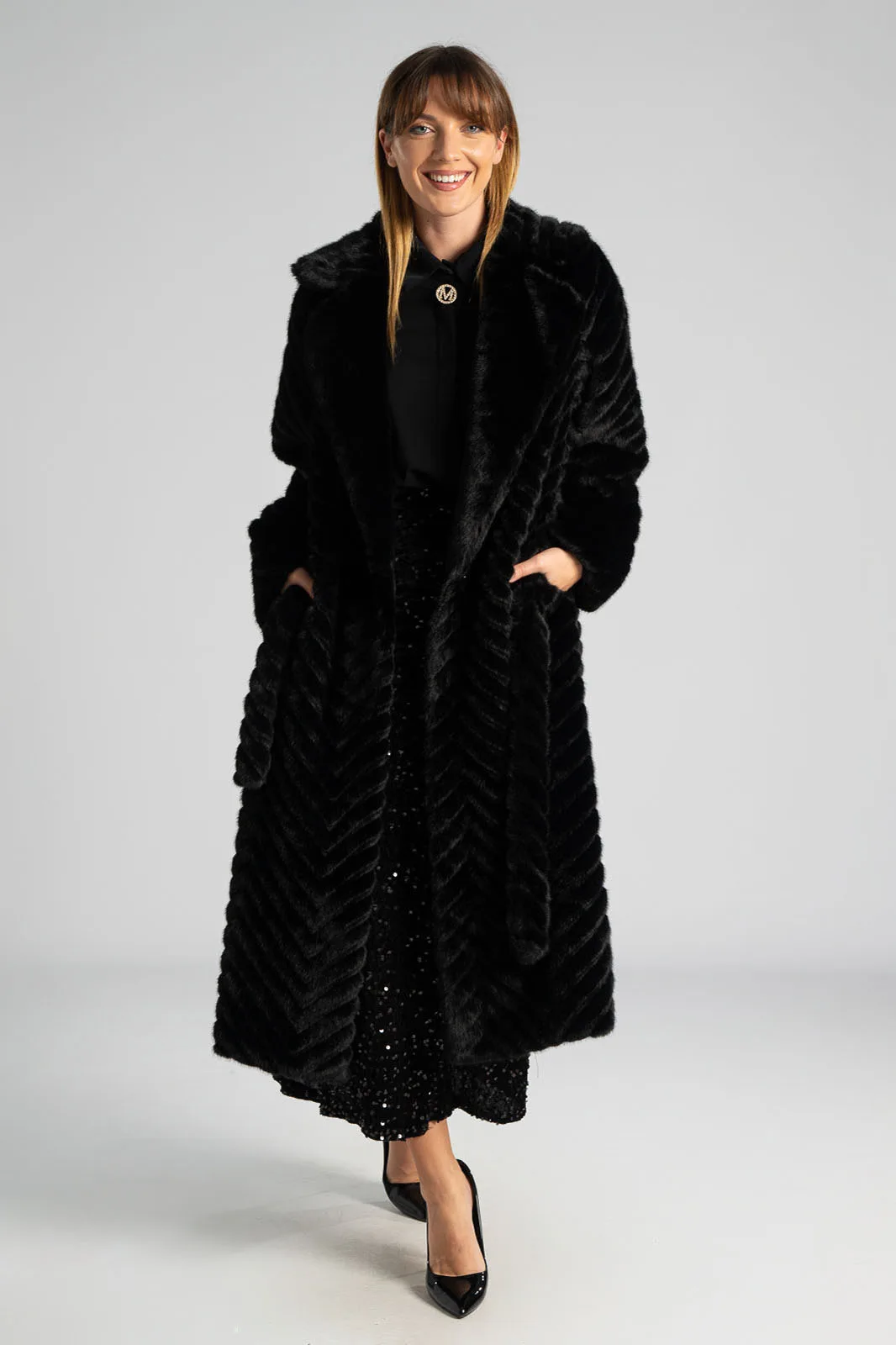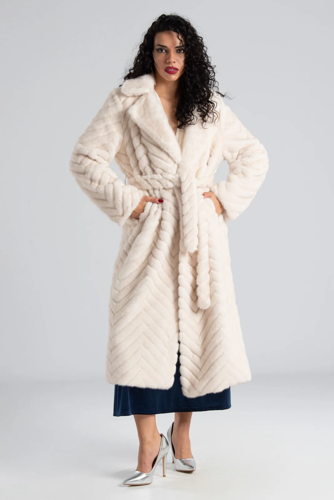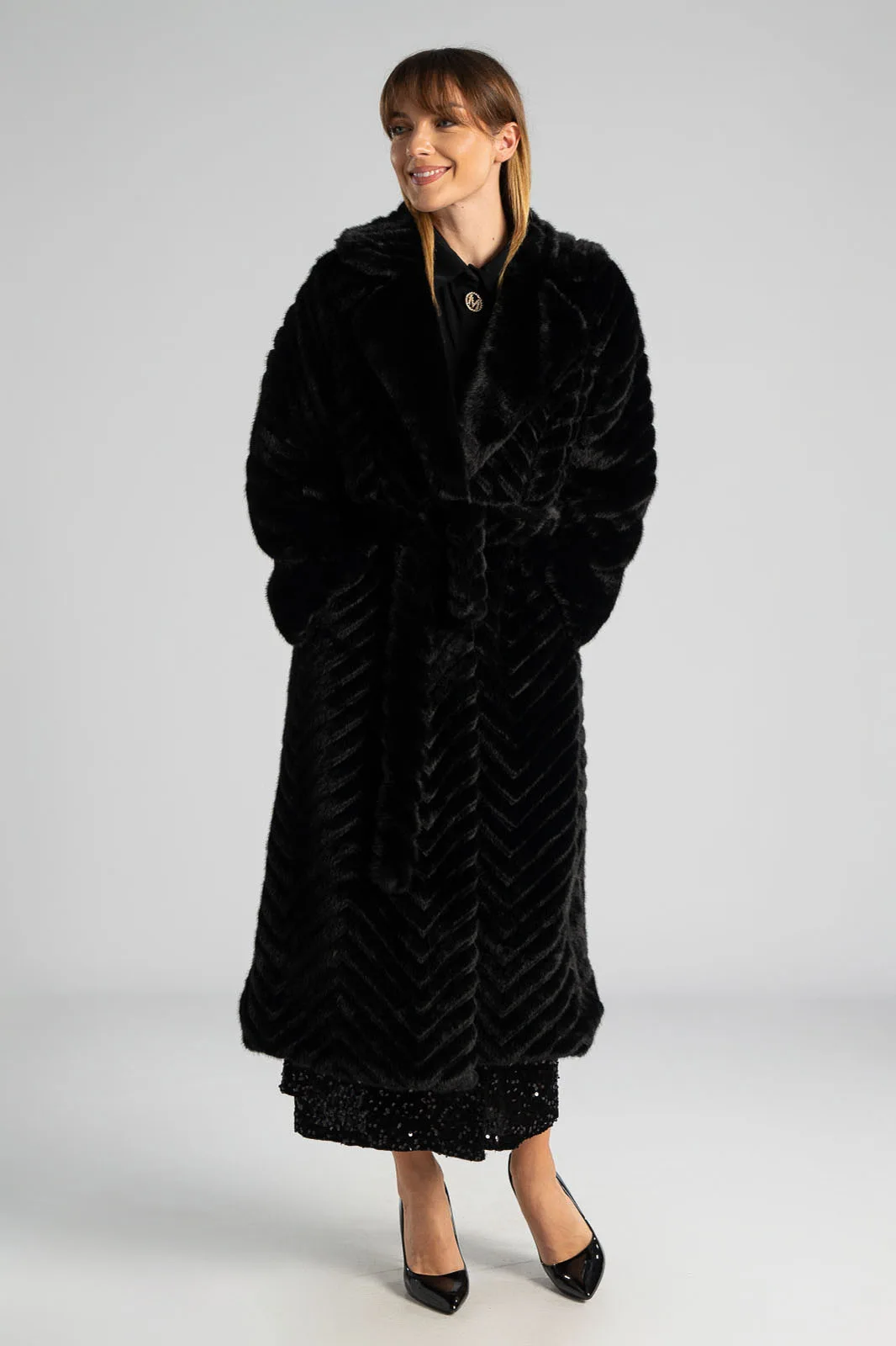 Παλτό με συνθετική γούνα. Έχει μακριά μανίκια, γιακά και πέτο. Είναι σε ίσια γραμμή και κλείνει με κόπιτσες. Στα πλαϊνά έχει τσέπες και δική του ζώνη. Εσωτερικά είναι φοδραρισμένο. Η μέτρηση έγινε με κλειστές κόπιτσες. Οι μετρήσεις του πίνακα είναι αντιπροσωπευτικές για κάθε κωδικό. 100% polyester.