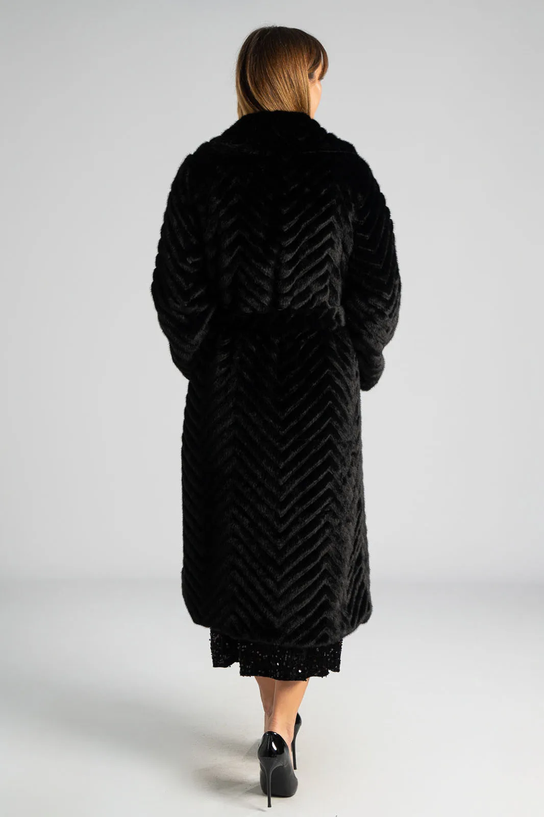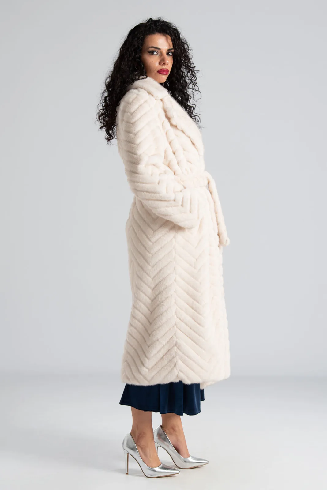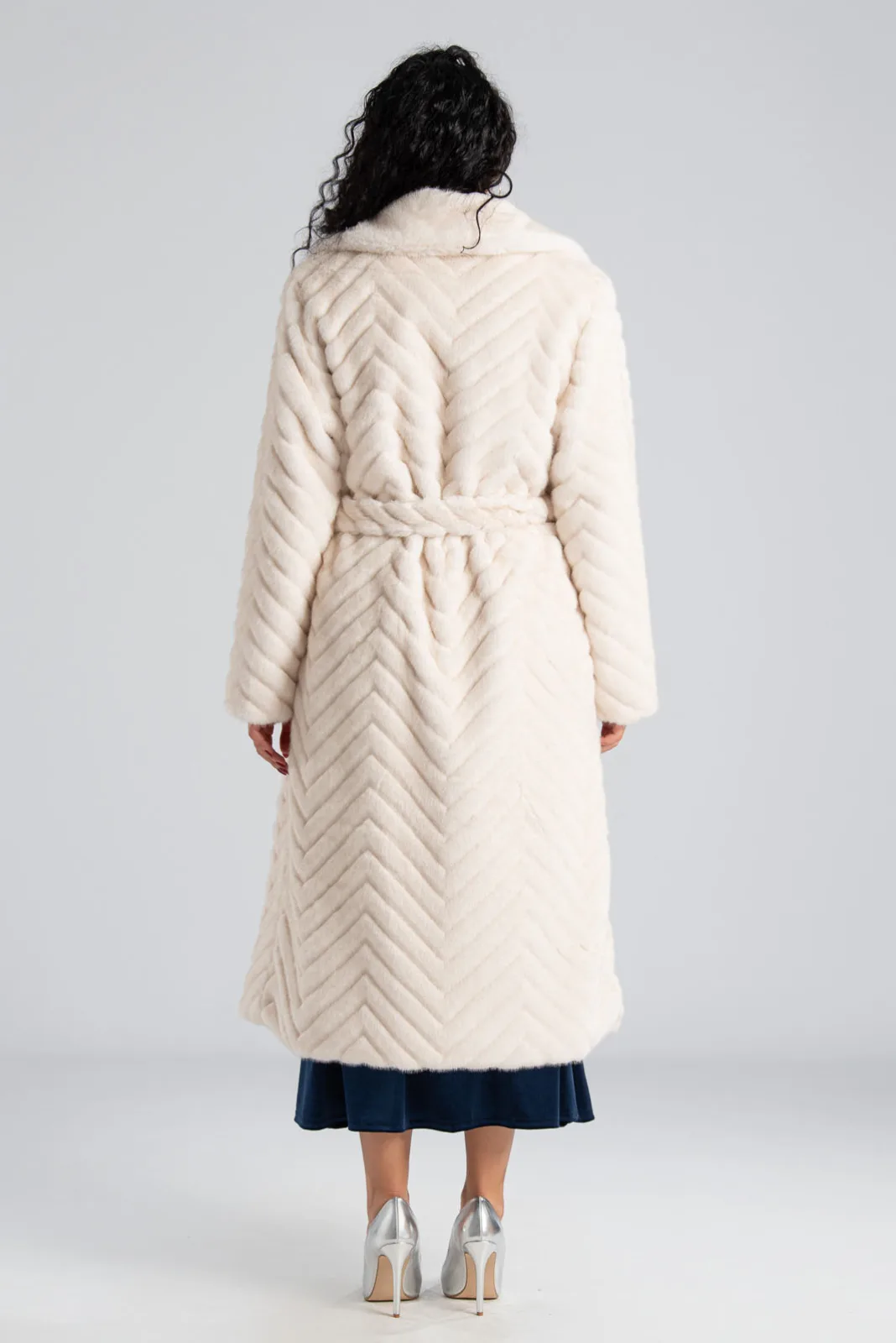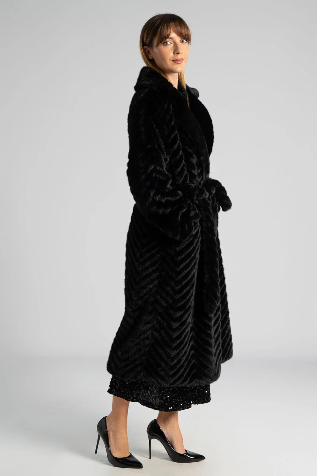Παλτό με συνθετική γούνα. Έχει μακριά μανίκια, γιακά και πέτο. Είναι σε ίσια γραμμή και κλείνει με κόπιτσες. Στα πλαϊνά έχει τσέπες και δική του ζώνη. Εσωτερικά είναι φοδραρισμένο. Η μέτρηση έγινε με κλειστές κόπιτσες. Οι μετρήσεις του πίνακα είναι αντιπροσωπευτικές για κάθε κωδικό. 100% polyester.