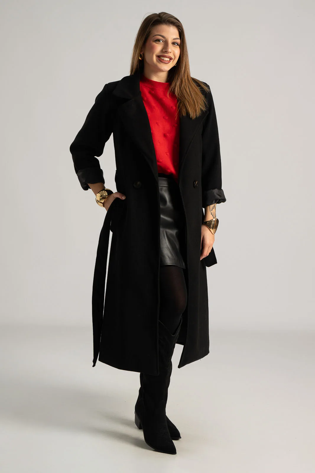 Long coat with collar and lapels. It has long sleeves. It has pockets on the sides. It fastens with a button and has a decorative detail. It is lined on the inside. It has its own belt in the same color and texture. The measurements were taken with the buttons closed. The measurements in the table are representative of each product. 90% polyester, 10% viscose.