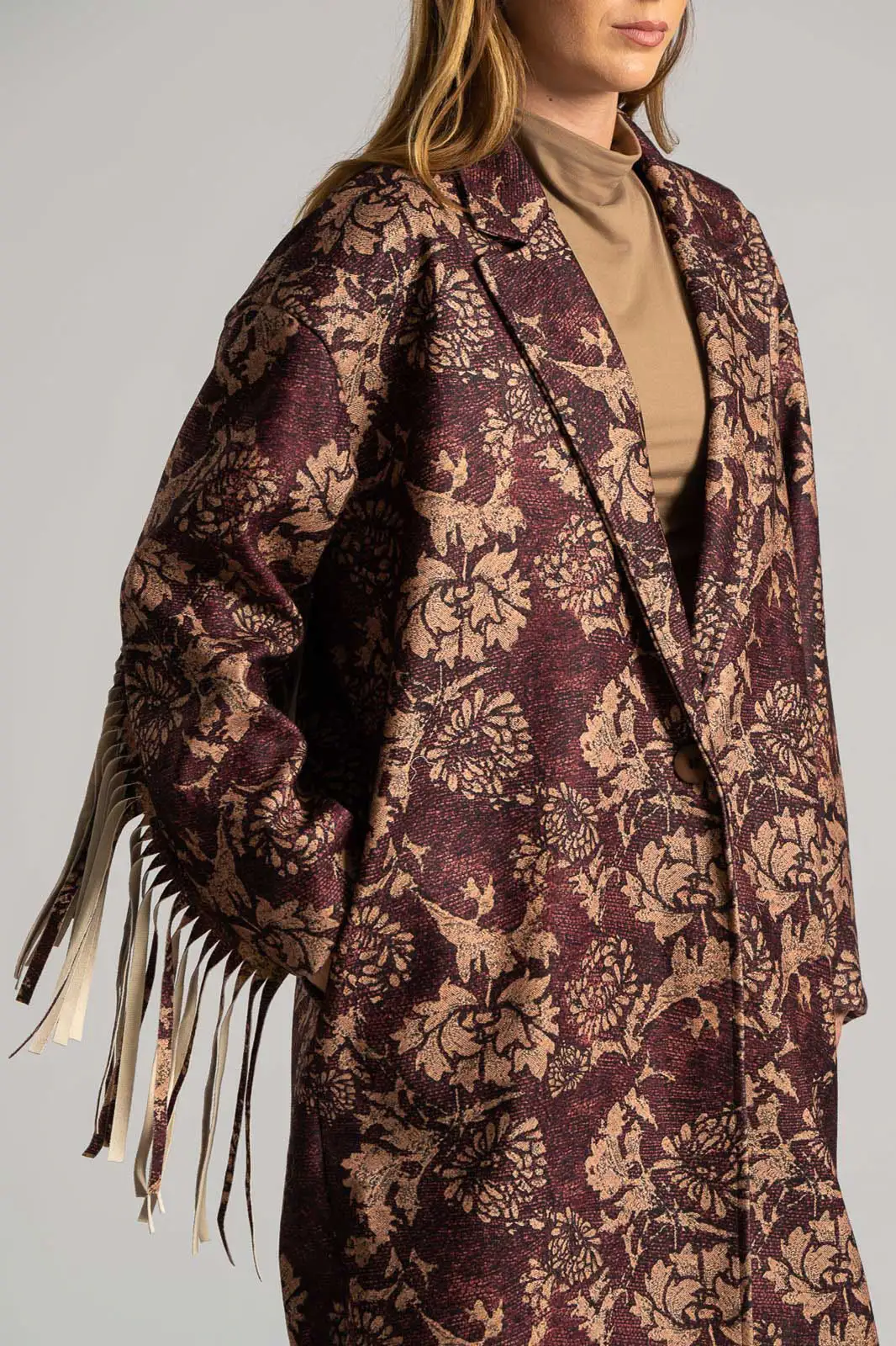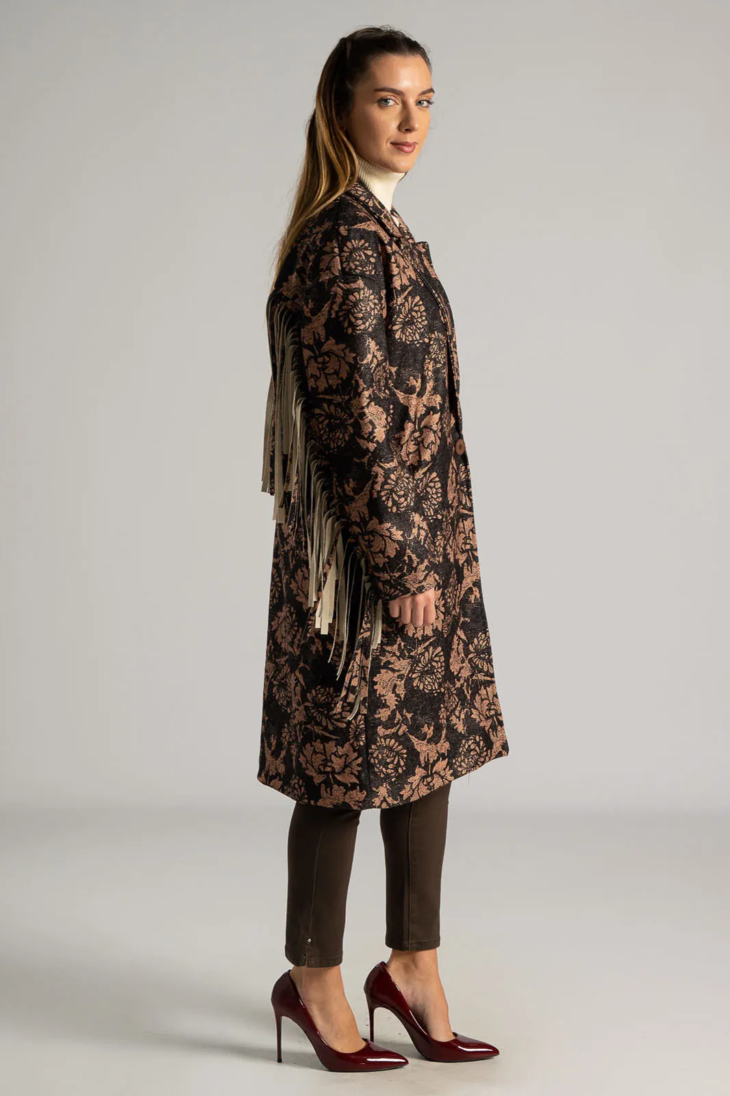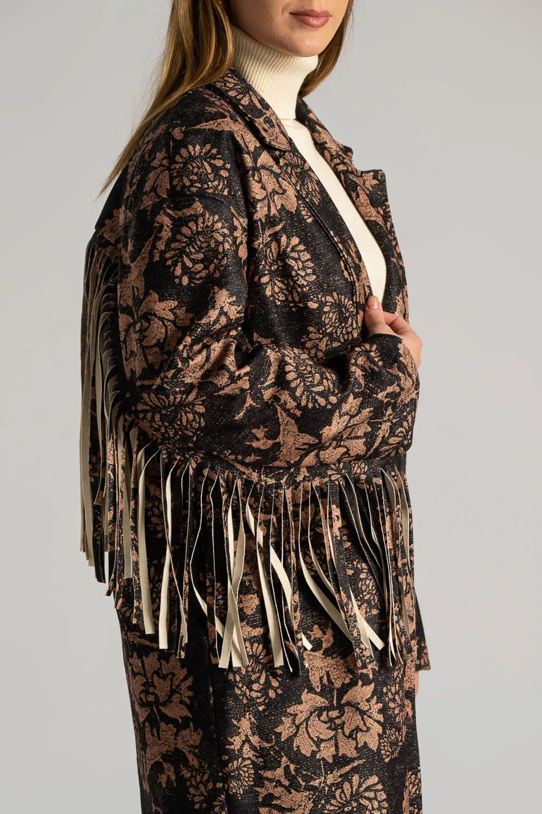Παλτό υφασμάτινο με γιακά και πέτο. Έχει μακριά μανίκια όπου στο κάτω μέρος τους διαθέτει μακριά διακοσμητικά κρόσια. Έχει πλαινές τσέπες. Στο πίσω μέρος στο ύψος της πλάτης έχει επίσης διακοσμητικά κρόσια στην ίδια απόχρωση και υφή. Σε όλη την επιφάνεια του έχει floral pattern. Εσωτερικά είναι φοδραρισμένο. Κλείνει με ένα κουμπί. Η μέτρηση έχει γίνει με κλειστό κουμπί. Οι μετρήσεις του πίνακα είναι αντιπροσωπευτικές για κάθε προϊόν. 100% polyester.