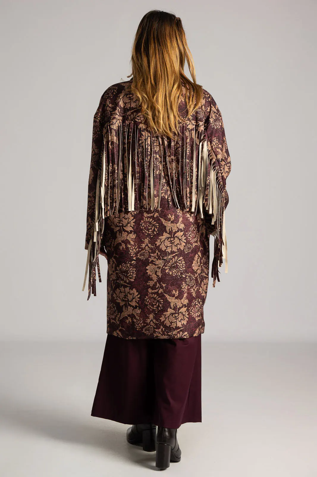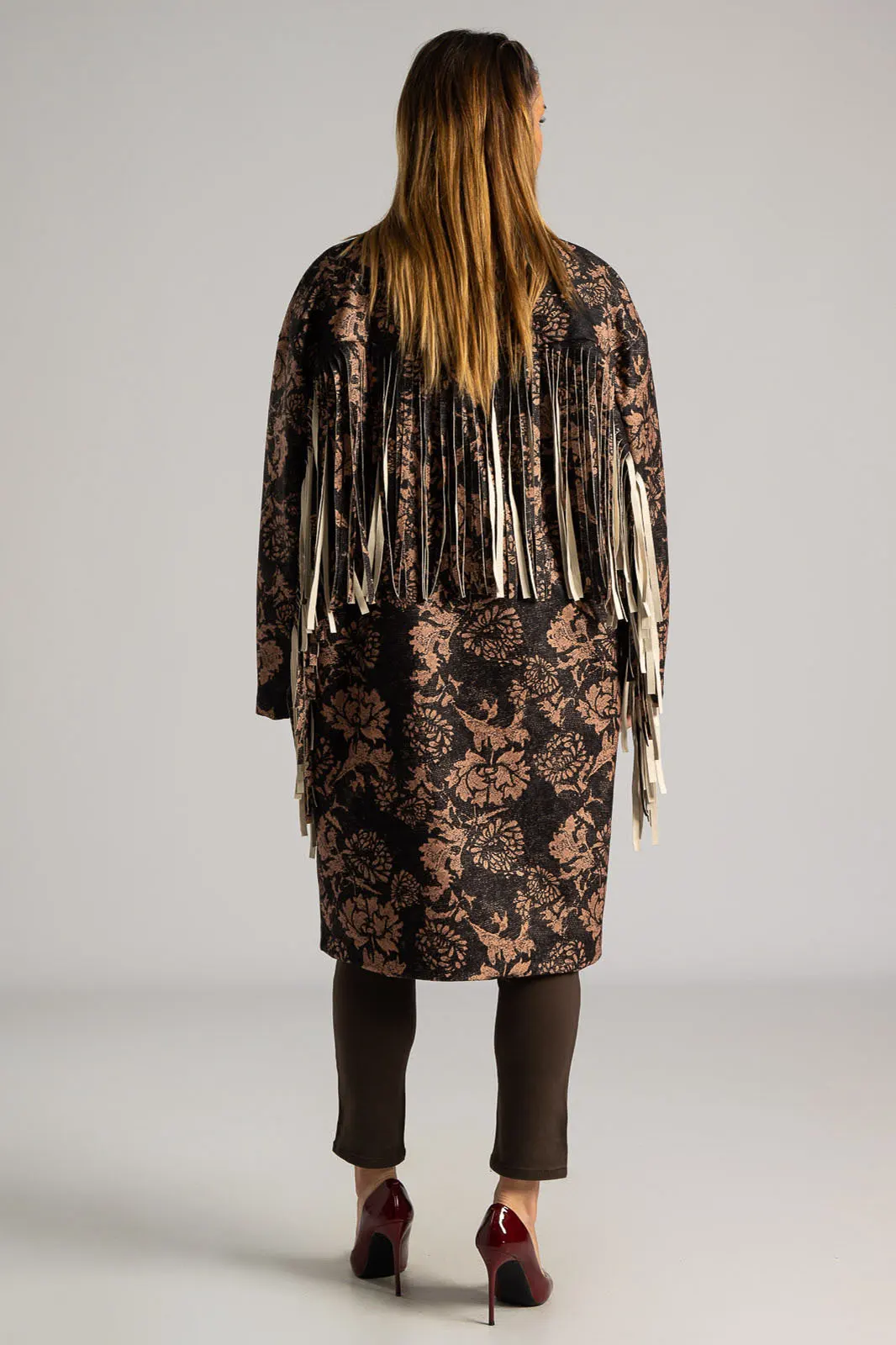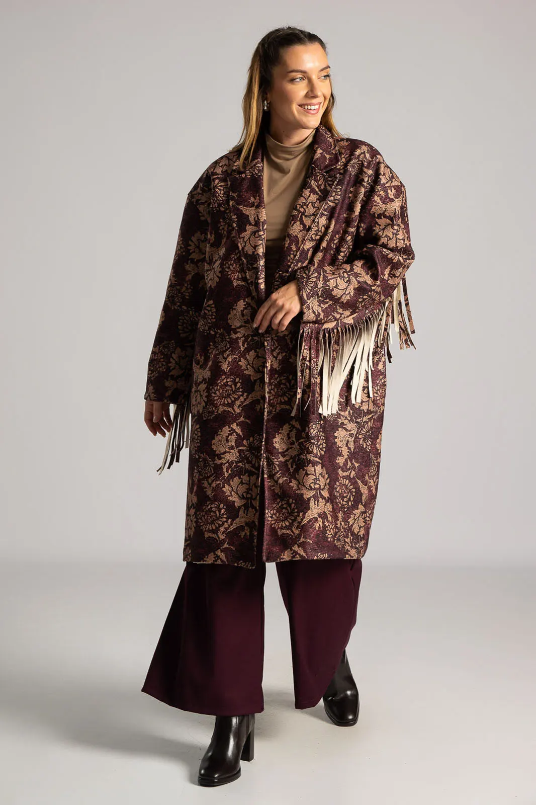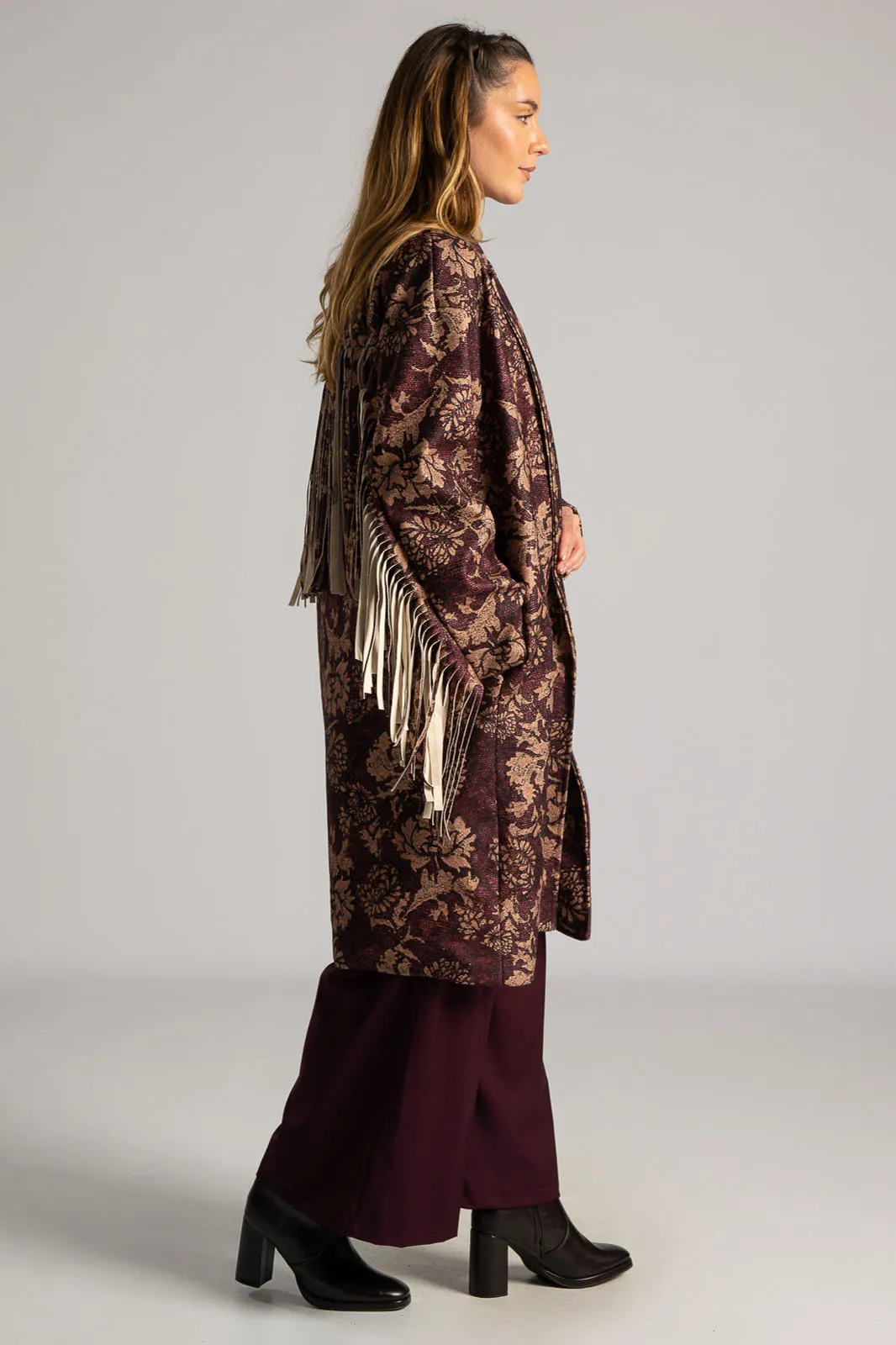 Παλτό υφασμάτινο με γιακά και πέτο. Έχει μακριά μανίκια όπου στο κάτω μέρος τους διαθέτει μακριά διακοσμητικά κρόσια. Έχει πλαινές τσέπες. Στο πίσω μέρος στο ύψος της πλάτης έχει επίσης διακοσμητικά κρόσια στην ίδια απόχρωση και υφή. Σε όλη την επιφάνεια του έχει floral pattern. Εσωτερικά είναι φοδραρισμένο. Κλείνει με ένα κουμπί. Η μέτρηση έχει γίνει με κλειστό κουμπί. Οι μετρήσεις του πίνακα είναι αντιπροσωπευτικές για κάθε προϊόν. 100% polyester.