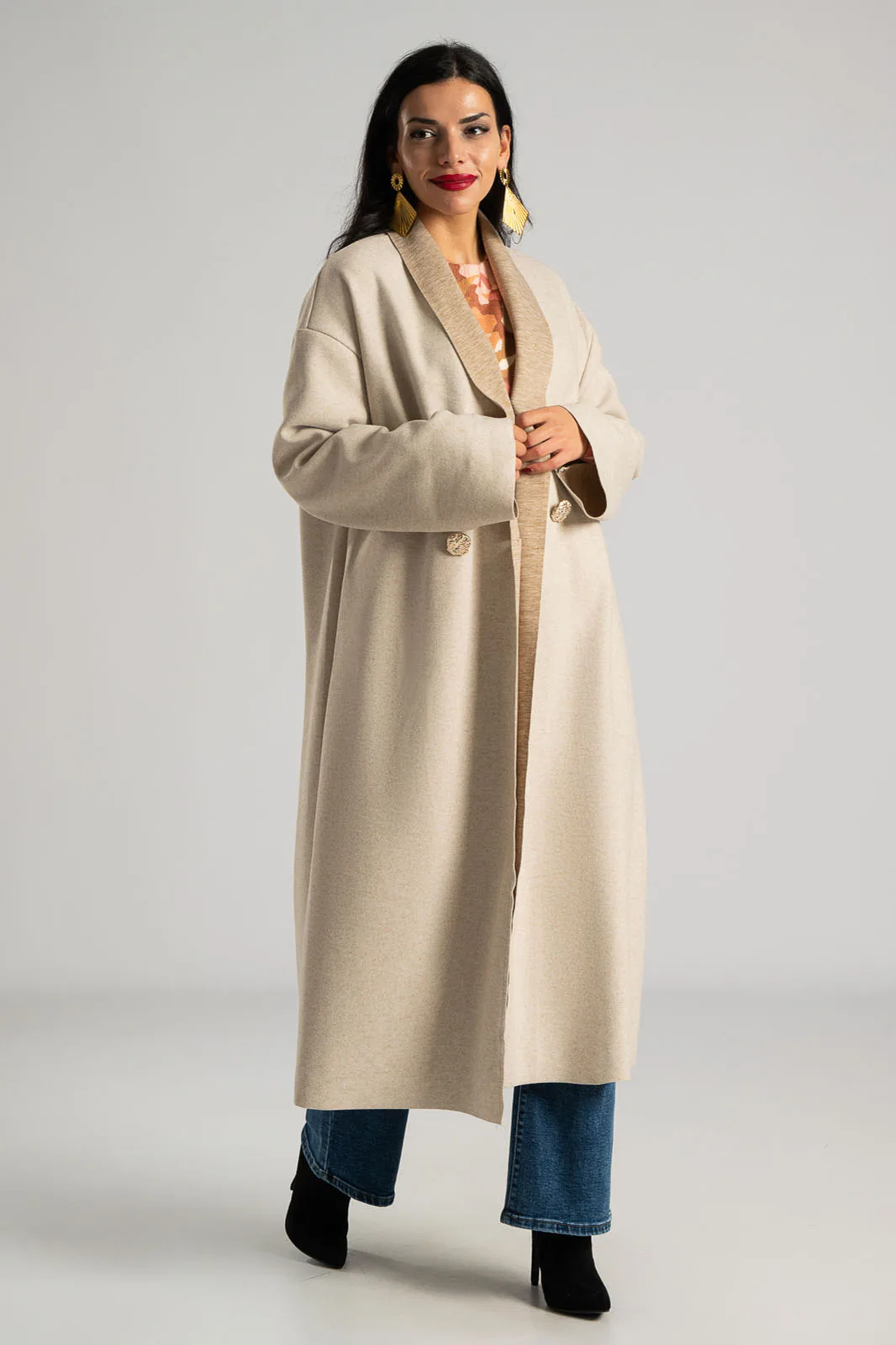 Coat with collar. It has long sleeves. It fastens at the front with a gold embossed button and has a decorative detail. It is not lined. The measurements were taken with the button fastened. The measurements in the table are representative of each code. 100% polyester.