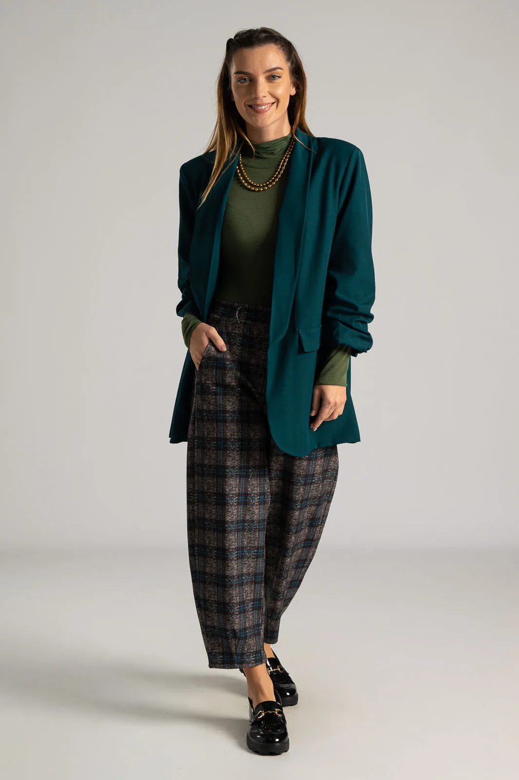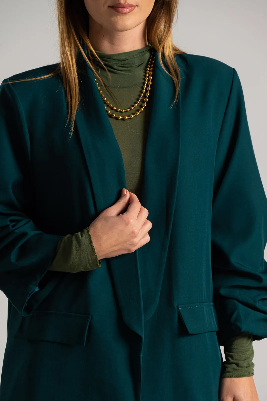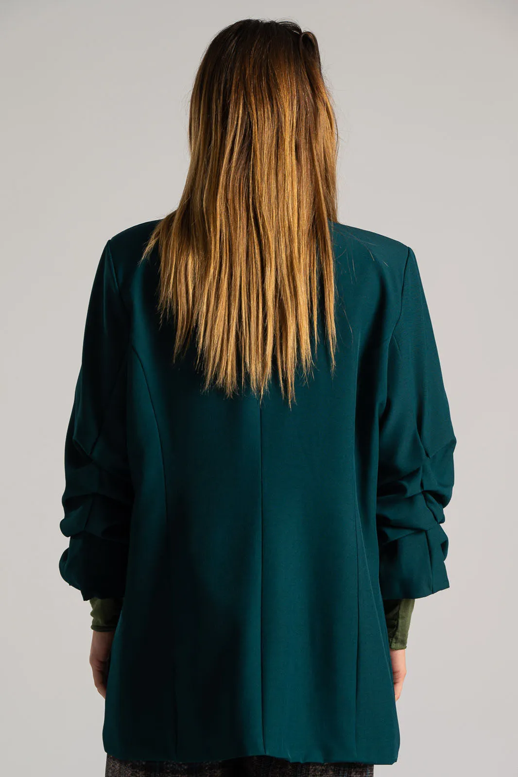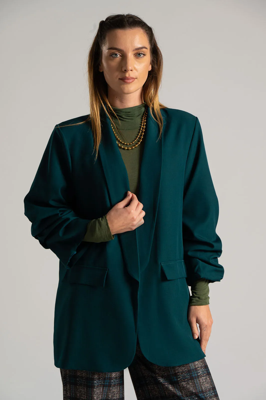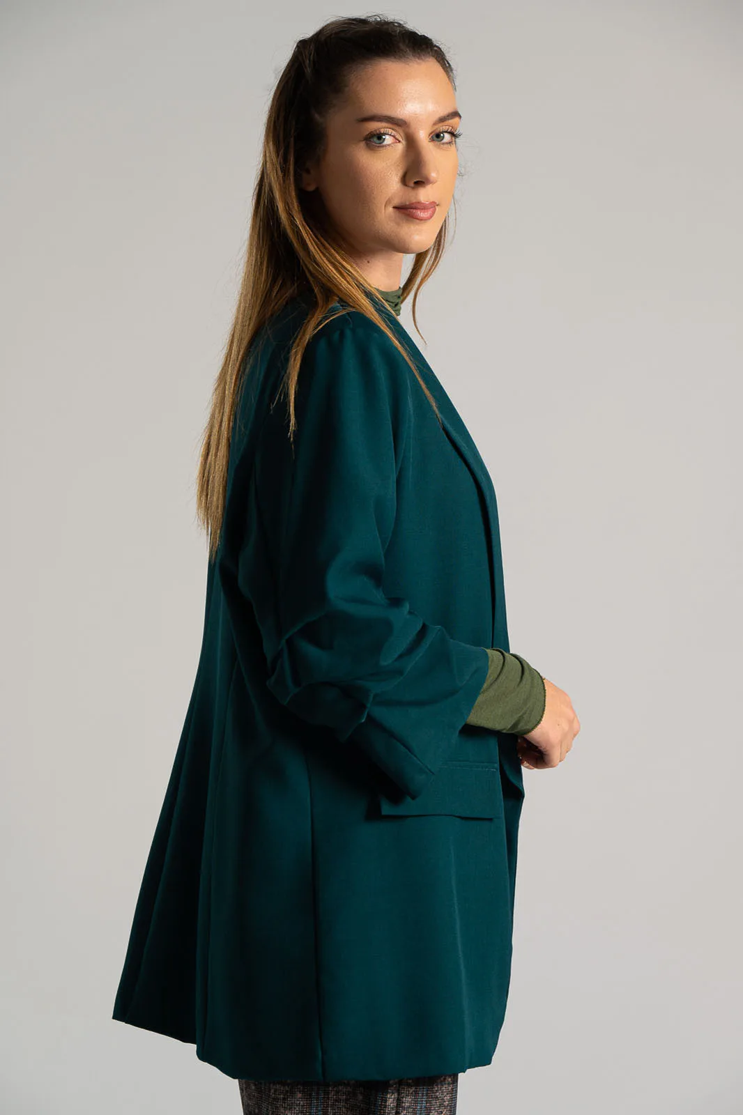 Σακάκι με μακρύ πέτο. Δεν διαθέτει κουμπί. Διαθέτει τσέπες εικονικές με καπάκι και στους ώμους έχει βάτες. Εσωτερικά είναι φοδραρισμένο. Τα μανίκια είναι 3/4 και καταλήγουν σε σούρα. Η μέτρηση της πλάτης έχει γίνει από την πίσω μεριά μασχάλη με μασχάλη. Οι μετρήσεις του πίνακα είναι αντιπροσωπευτικές για κάθε κωδικό. 95% polyester, 5% elastan.