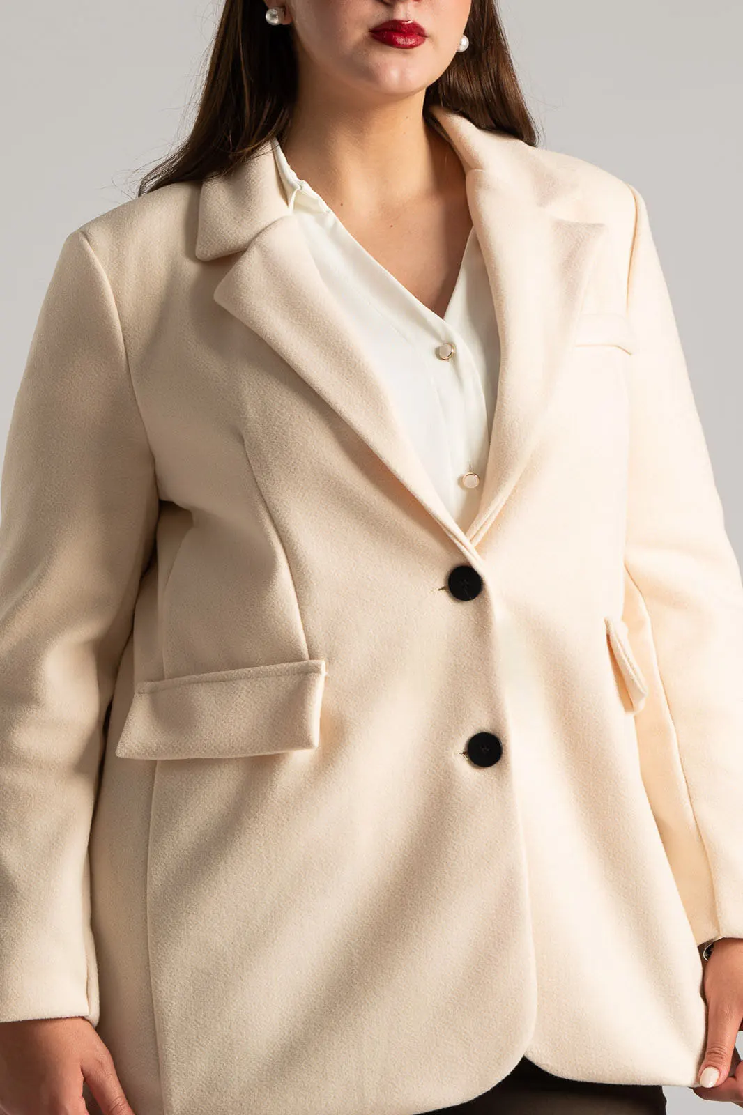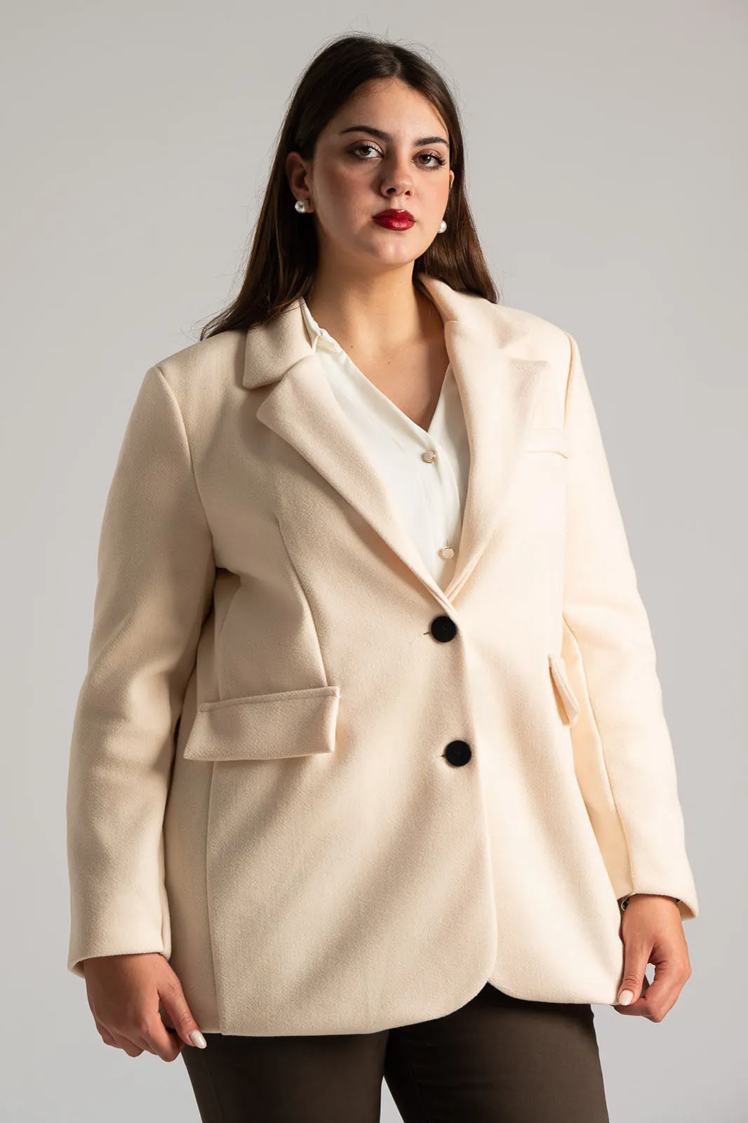 Σακάκι με γιακά και πέτο. Διαθέτει μακριά μανίκια που καταλήγουν σε διακοσμητικά κουμπιά. Κλείνει με δύο κουμπιά. Στο μπροστινό μέρος έχει δύο τσέπες εικονικές με καπάκι και στο επάνω μέρος μια με ρέλι. Εσωτερικά είναι φοδραρισμένο. Οι μετρήσεις του πίνακα είναι αντιπροσωπευτικές για κάθε κωδικό. 100% polyester.