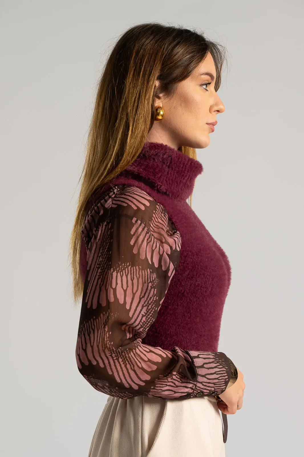Crop top with loose turtleneck. It is sleeveless and has a furry surface. The measurements in the table are representative of each code. 95% viscose, 5% elastane.