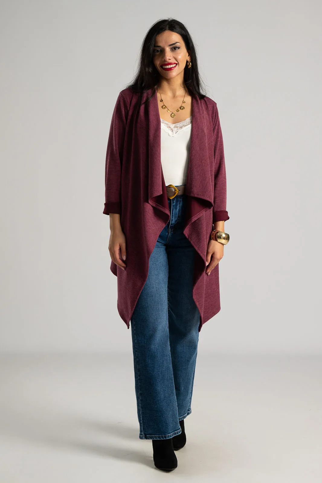 Thick knit cardigan with a compact weave. It has long sleeves. It is asymmetrical at the hem and opening. The measurement was taken with the opening of one palm. It has no buttons or zippers. It has side pockets. The measurements in the table are representative for each code. 28% viscose, 69% polyester, 3% elastane.