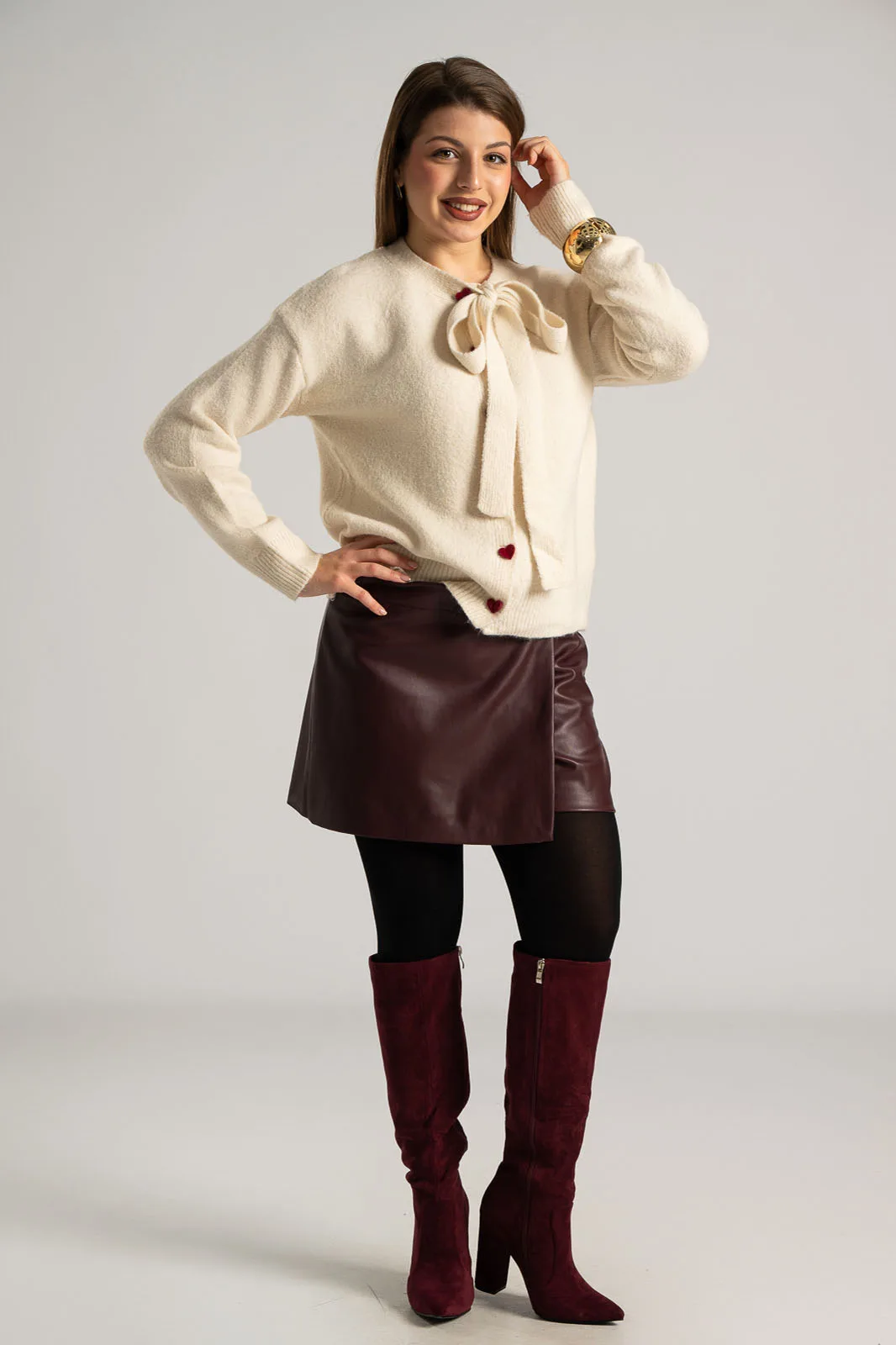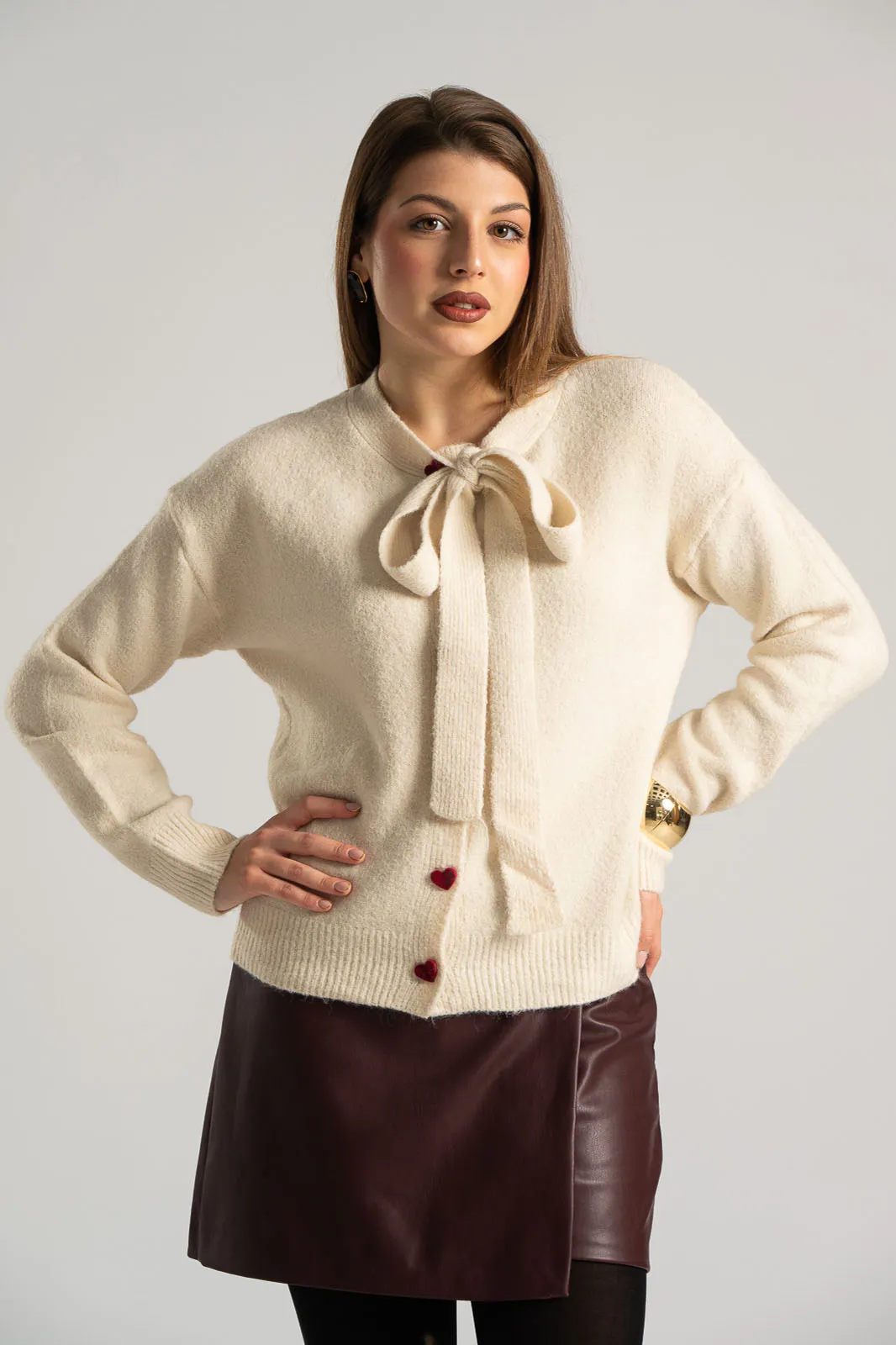 Cardigan with round neckline. It has long sleeves, closes with heart-shaped buttons and has a velvet texture. The neckline has two strips in the same shade and texture that can be tied into a bow. The measurements were taken with the buttons closed. The measurements in the table are representative for each code. 71% polyester, 13% polyamide, 3% acrylic.